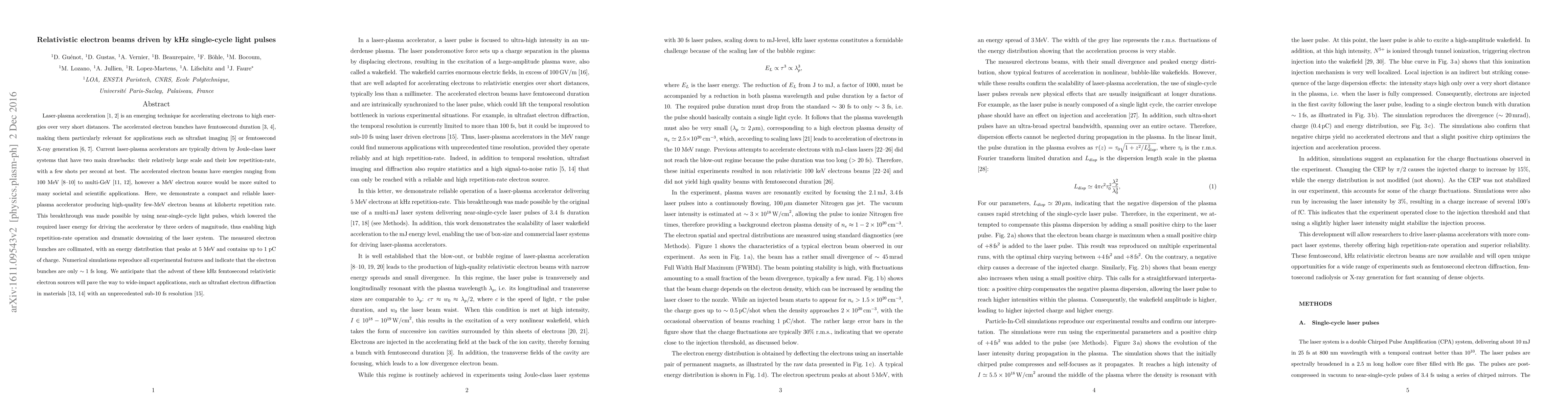 Laser-plasma acceleration is an emerging technique for accelerating electrons to high energies over very short distances. The accelerated electron bunches have femtosecond duration, making them particularly relevant for applications such as ultrafast imaging or femtosecond X-ray generation. Current laser-plasma accelerators are typically driven by Joule-class laser systems that have two main drawbacks: their relatively large scale and their low repetition-rate, with a few shots per second at best. The accelerated electron beams have energies ranging from 100 MeV to multi-GeV, however a MeV electron source would be more suited to many societal and scientific applications. Here, we demonstrate a compact and reliable laser-plasma accelerator producing high-quality few-MeV electron beams at kilohertz repetition rate. This breakthrough was made possible by using near-single-cycle light pulses, which lowered the required laser energy for driving the accelerator by three orders of magnitude, thus enabling high repetition-rate operation and dramatic downsizing of the laser system. The measured electron bunches are collimated, with an energy distribution that peaks at 5 MeV and contains up to 1 pC of charge. Numerical simulations reproduce all experimental features and indicate that the electron bunches are only $\sim 1$ fs long. We anticipate that the advent of these kHz femtosecond relativistic electron sources will pave the way to wide-impact applications, such as ultrafast electron diffraction in materials with an unprecedented sub-10 fs resolution.