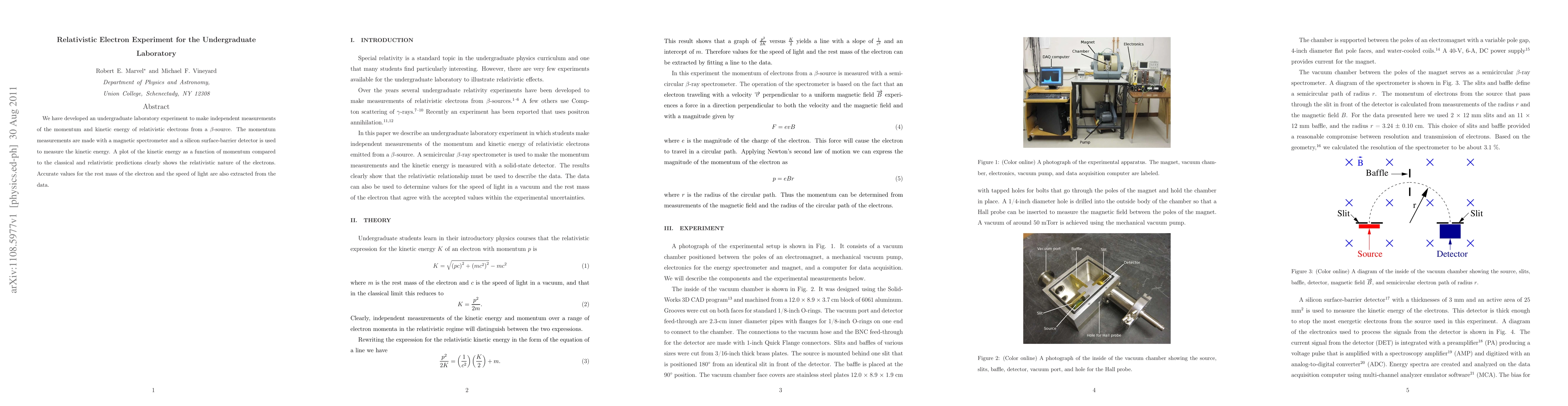 This paper details an undergraduate lab experiment measuring relativistic electron momentum and kinetic energy from a beta-source, using a magnetic spectrometer and silicon detector. The results demonstrate the relativistic nature of electrons, and the experiment also extracts accurate values for the electron's rest mass and the speed of light.