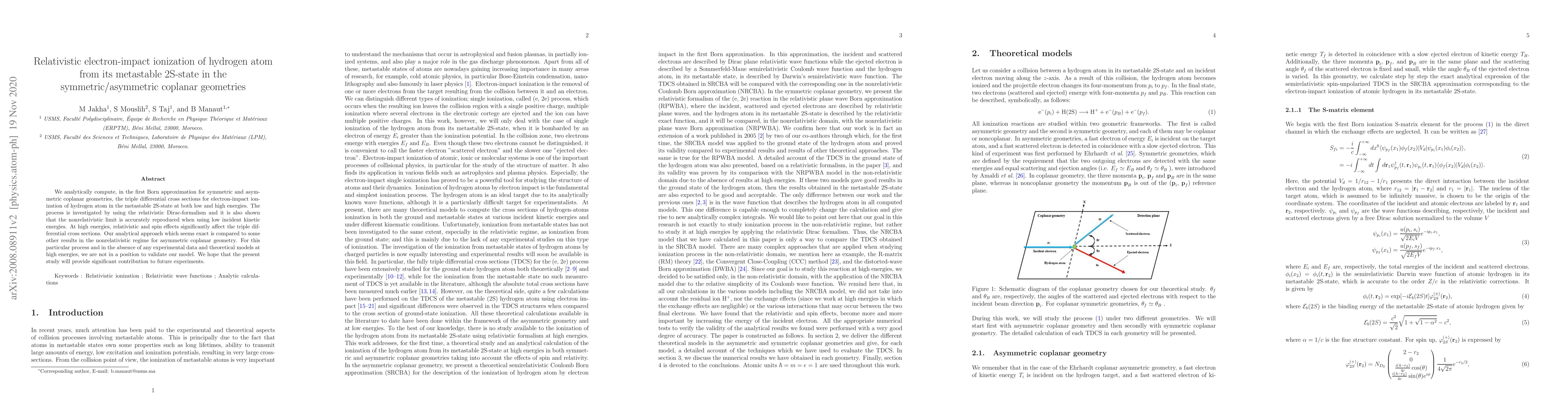 This paper analytically computes the triple differential cross sections for relativistic electron-impact ionization of hydrogen in its metastable 2S-state, using the relativistic Dirac-formalism for both symmetric and asymmetric coplanar geometries. The study highlights the significant effects of relativistic and spin effects at high energies.