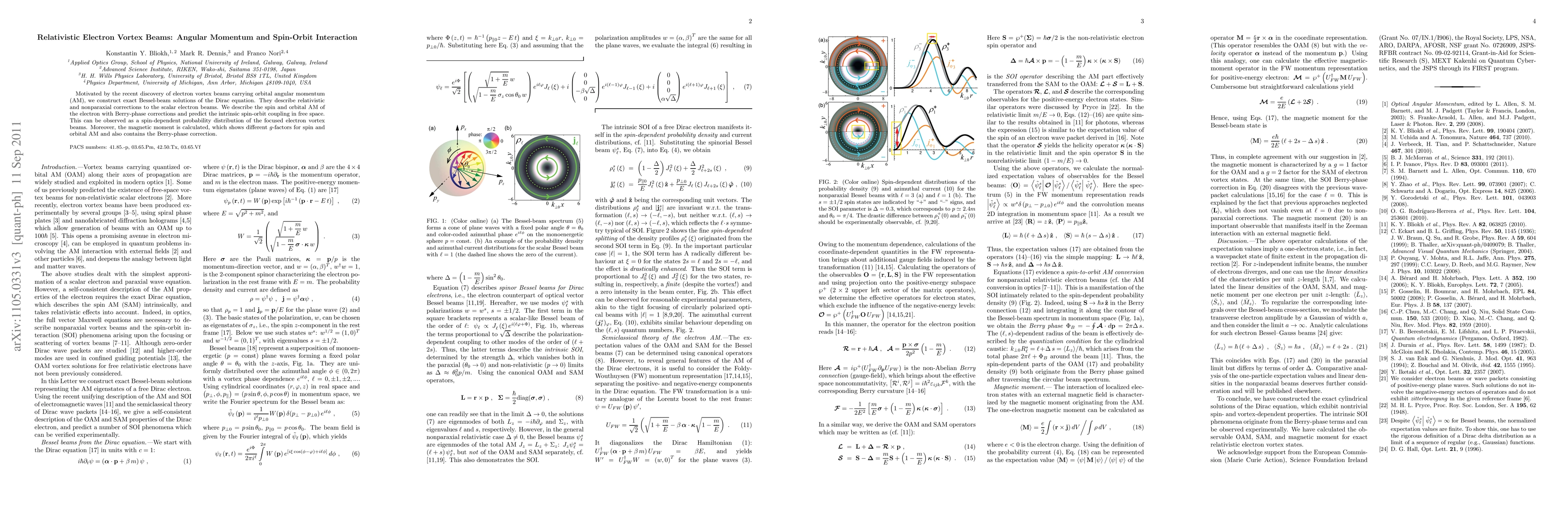 Motivated by the recent discovery of electron vortex beams carrying orbital angular momentum (AM), we construct exact Bessel-beam solutions of the Dirac equation. They describe relativistic and nonparaxial corrections to the scalar electron beams. We describe the spin and orbital AM of the electron with Berry-phase corrections and predict the intrinsic spin-orbit coupling in free space. This can be observed as a spin-dependent probability distribution of the focused electron vortex beams. Moreover, the magnetic moment is calculated, which shows different $g$-factors for spin and orbital AM and also contains the Berry-phase correction.