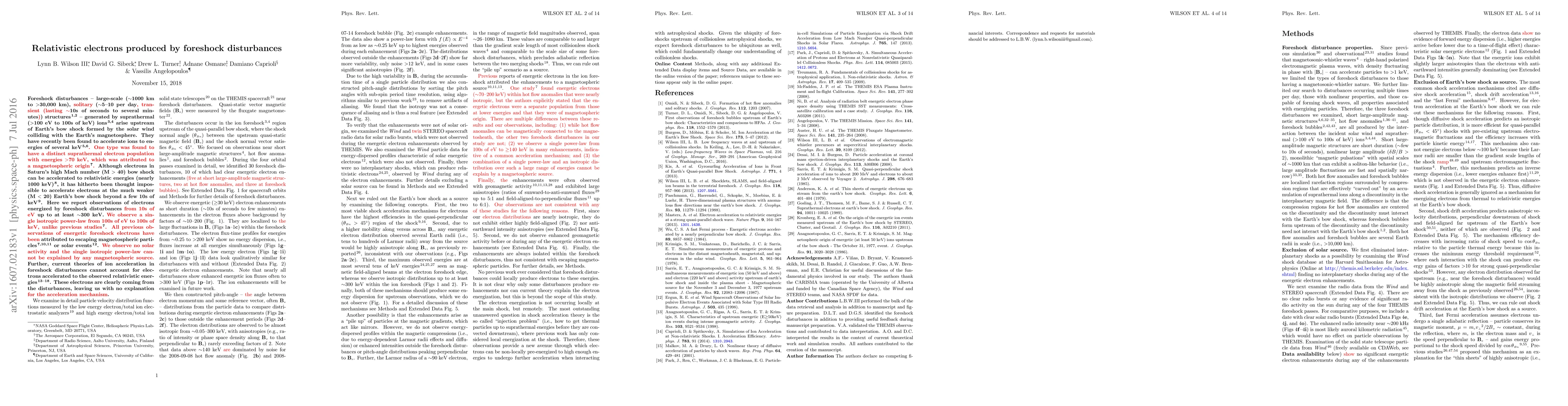This paper reports the observation of relativistic electrons (up to ~300 keV) accelerated by foreshock disturbances upstream of Earth's bow shock, challenging existing theories that such high-energy electron acceleration is impossible at the Earth's relatively weak bow shock. These electrons are not linked to solar activity or magnetospheric sources.
