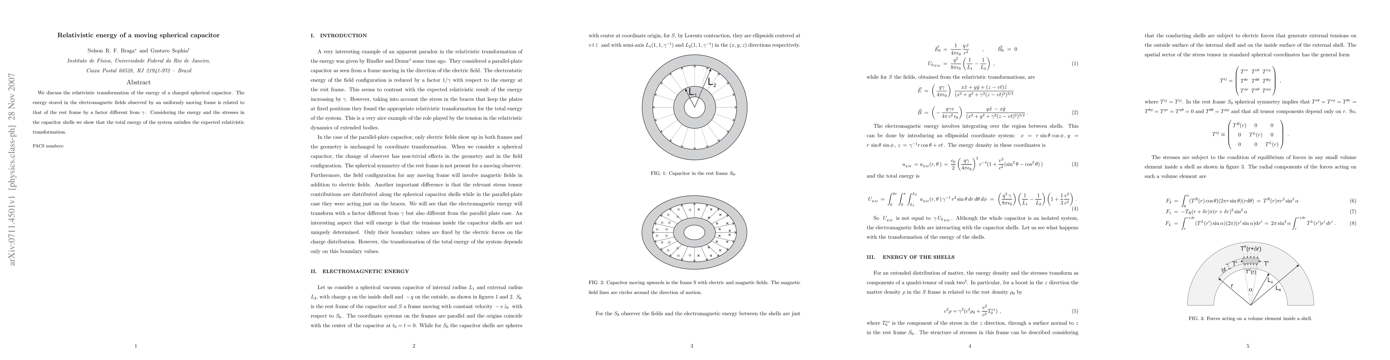 We discuss the relativistic transformation of the energy of a charged spherical capacitor. The energy stored in the electromagnetic fields observed by an uniformly moving frame is related to that of the rest frame by a factor different from $\gamma $. Considering the energy and the stresses in the capacitor shells we show that the total energy of the system satisfies the expected relativistic transformation.
