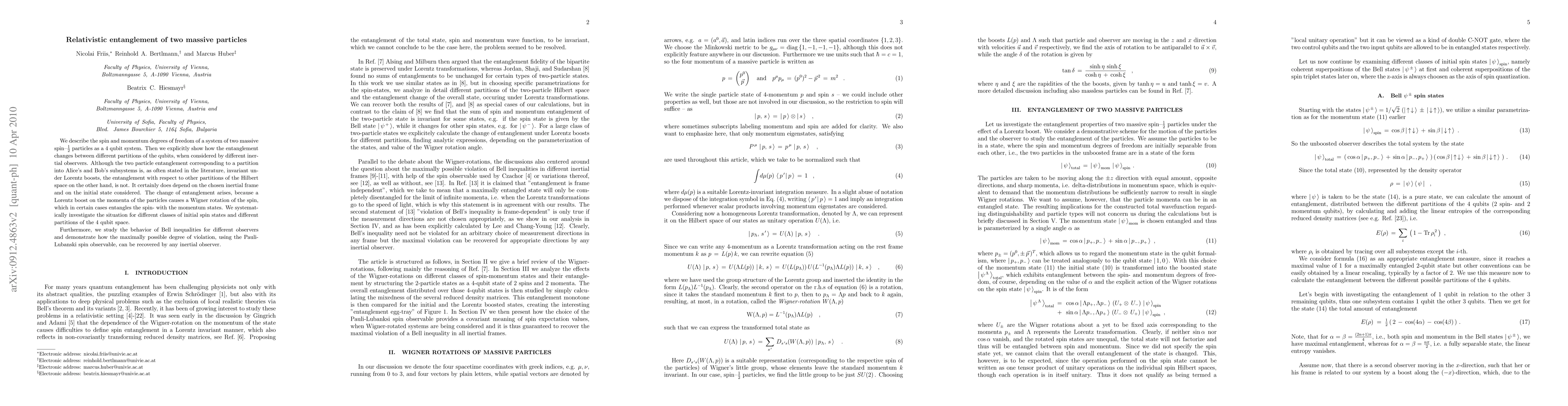 We describe the spin and momentum degrees of freedom of a system of two massive spin--$\tfrac{1}{2}$ particles as a 4 qubit system. Then we explicitly show how the entanglement changes between different partitions of the qubits, when considered by different inertial observers. Although the two particle entanglement corresponding to a partition into Alice's and Bob's subsystems is, as often stated in the literature, invariant under Lorentz boosts, the entanglement with respect to other partitions of the Hilbert space on the other hand, is not. It certainly does depend on the chosen inertial frame and on the initial state considered. The change of entanglement arises, because a Lorentz boost on the momenta of the particles causes a Wigner rotation of the spin, which in certain cases entangles the spin- with the momentum states. We systematically investigate the situation for different classes of initial spin states and different partitions of the 4 qubit space. Furthermore, we study the behavior of Bell inequalities for different observers and demonstrate how the maximally possible degree of violation, using the Pauli-Lubanski spin observable, can be recovered by any inertial observer.