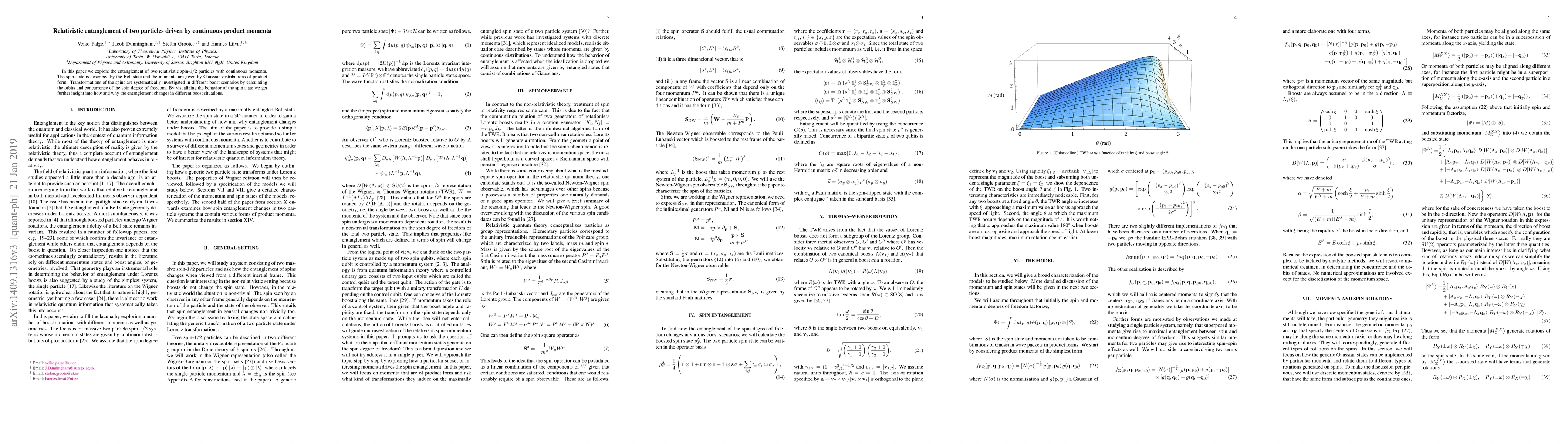 In this paper we explore the entanglement of two relativistic spin-$1/2$ particles with continuous momenta. The spin state is described by the Bell state and the momenta are given by Gaussian distributions of product form. Transformations of the spins are systematically investigated in different boost scenarios by calculating the orbits and concurrence of the spin degree of freedom. By visualizing the behavior of the spin state we get further insight into how and why the entanglement changes in different boost situations.