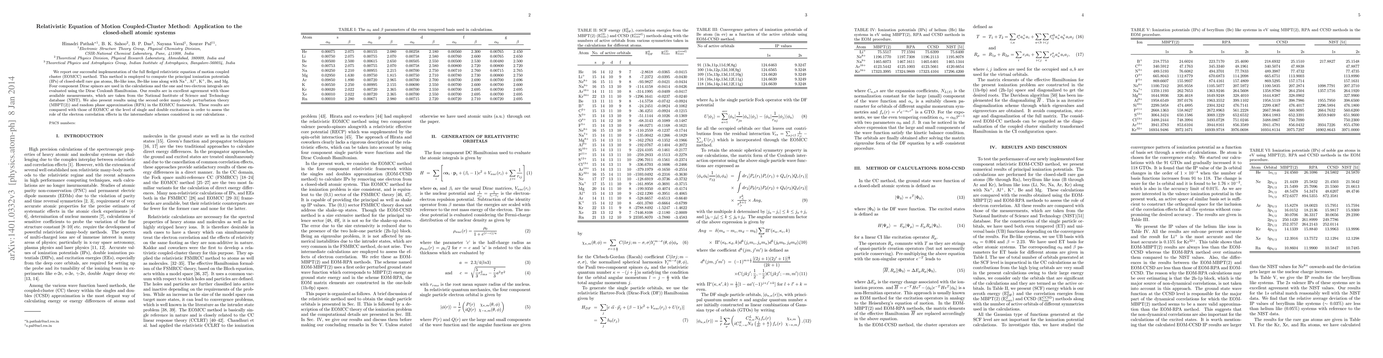 We report our successful implementation of the full fledged relativistic equation of motion coupled cluster (EOMCC) method. This method is employed to compute the principal ionization potentials (IPs) of closed-shell rare gas atoms, He-like ions, Be-like ions along with Na+, Al+, K+, Be, and Mg. Four component Dirac spinors are used in the calculations and the one and two electron integrals are evaluated using the Dirac Coulomb Hamiltonian. Our results are in excellent agreement with those available measurements, which are taken from the National Institute of Science and Technology database (NIST). We also present results using the second order many-body perturbation theory (MBPT(2)) and random phase approximation (RPA) in the EOMCC framework. These results are compared with those of EOMCC at the level of single and double excitations in order to assess the role of the electron correlation effects in the intermediate schemes considered in our calculations .