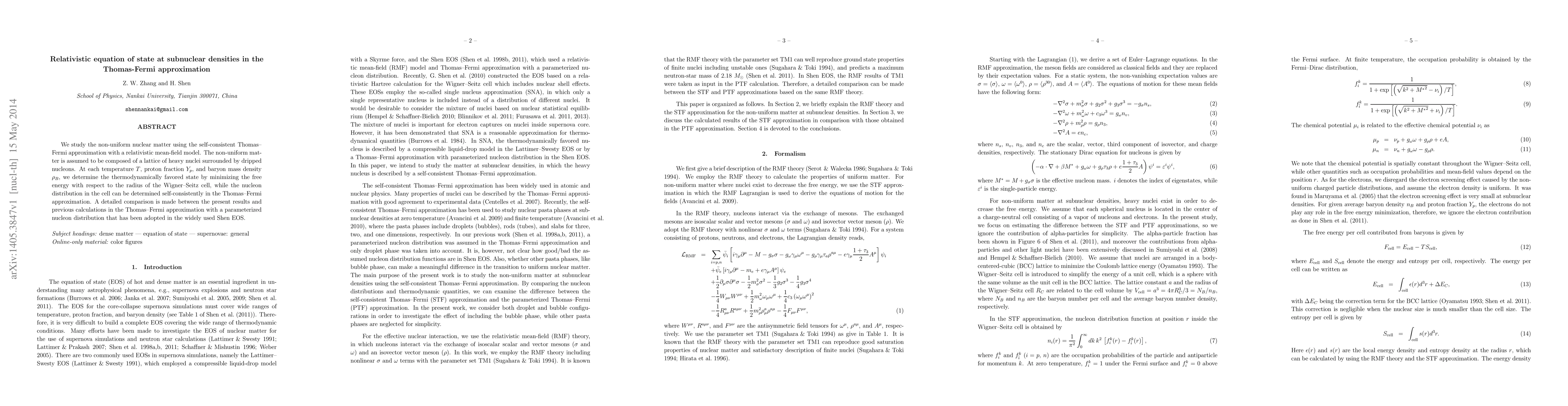 This paper explores the relativistic equation of state for non-uniform nuclear matter using the Thomas-Fermi approximation and a relativistic mean-field model, focusing on a lattice of heavy nuclei with surrounding dripped nucleons. It compares its results with previous calculations, particularly those based on the Shen EOS.