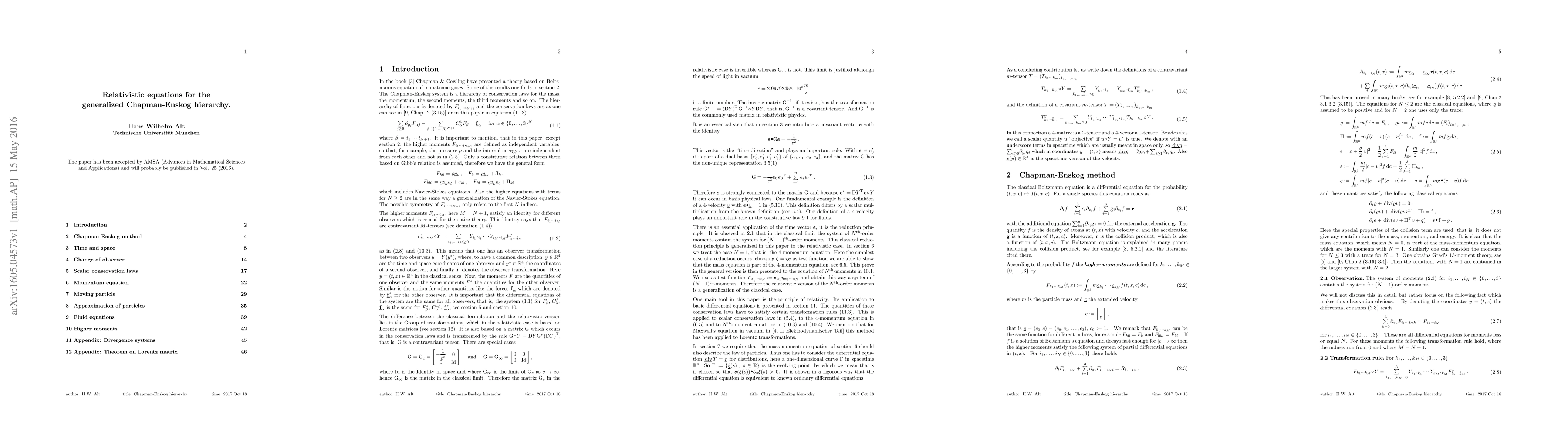 From the Boltzmann equation Chapman and Cowling have firstly motivated a hierarchy of differential equations. I consider a general version of these differential equations which contain the Navier-Stokes system. In the paper I derive a relativistic version of these partial differential equations. This is interesting because in the derivation a covariant version of a time direction is used. This time direction is needed to derive a reduction of the differential equations.
