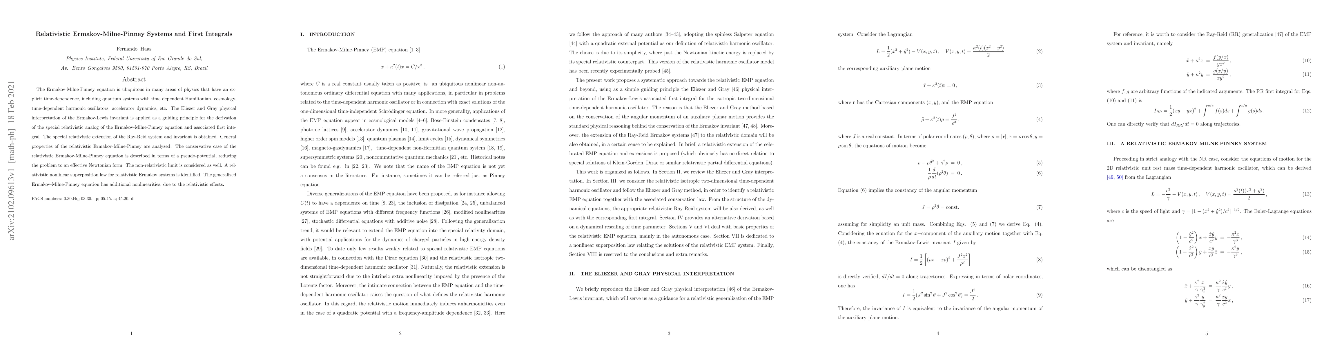 This paper derives the special relativistic analog of the Ermakov-Milne-Pinney equation and its associated first integral, analyzing the general properties and conservative case in terms of a pseudo-potential. It also identifies a relativistic nonlinear superposition law for these systems.