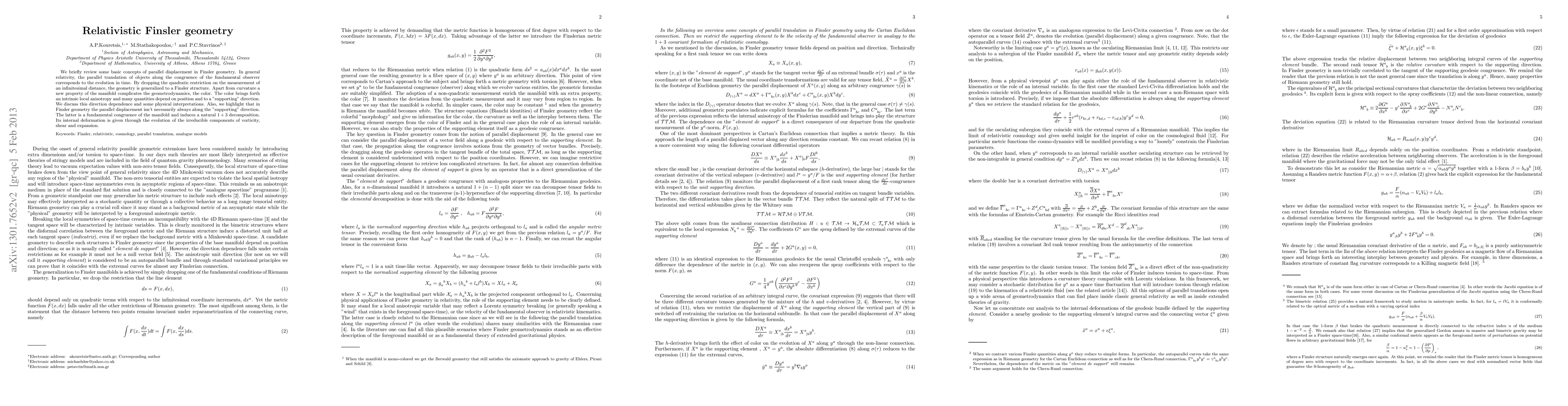 We briefly review some basic concepts of parallel displacement in Finsler geometry. In general relativity, the parallel translation of objects along the congruence of the fundamental observer corresponds to the evolution in time. By dropping the quadratic restriction on the measurement of an infinitesimal distance, the geometry is generalized to a Finsler structure. Apart from curvature a new property of the manifold complicates the geometrodynamics, the color. The color brings forth an intrinsic local anisotropy and many quantities depend on position and to a "supporting" direction. We discuss this direction dependence and some physical interpretations. Also, we highlight that in Finsler geometry the parallel displacement isn't necessarily always along the "supporting" direction. The latter is a fundamental congruence of the manifold and induces a natural 1+3 decomposition. Its internal deformation is given through the evolution of the irreducible components of vorticity, shear and expansion.