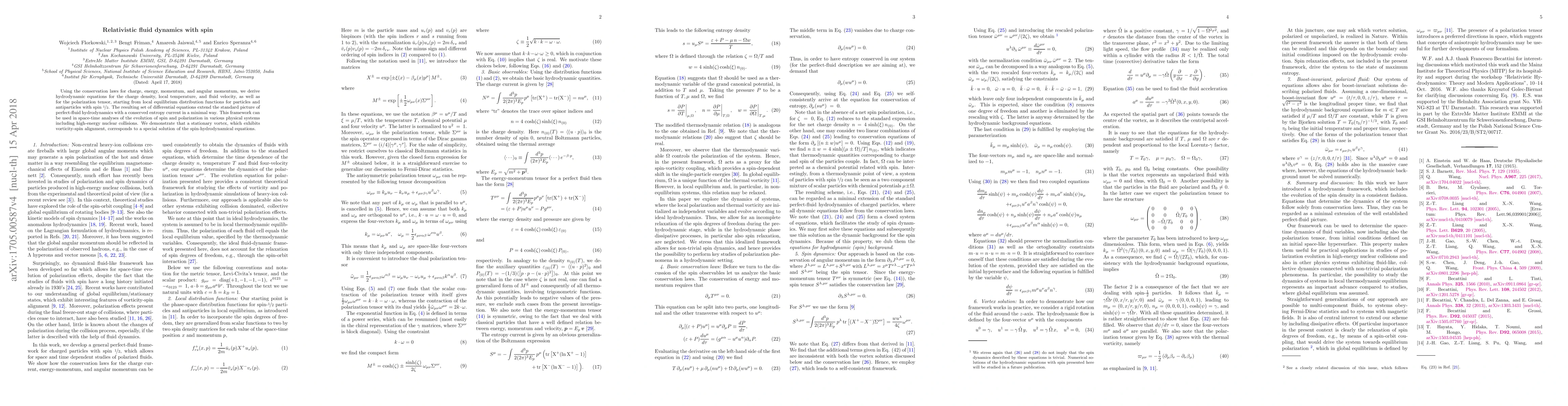 Using the conservation laws for charge, energy, momentum, and angular momentum, we derive hydrodynamic equations for the charge density, local temperature, and fluid velocity, as well as for the spin tensor, starting from local equilibrium distribution functions for particles and antiparticles with spin 1/2. The resulting set of differential equations extend the standard picture of perfect-fluid hydrodynamics with a conserved entropy current in a minimal way. This framework can be used in space-time analyzes of the evolution of spin and polarization in various physical systems including high-energy nuclear collisions. We demonstrate that a stationary vortex, which exhibits vorticity-spin alignment, corresponds to a special solution of the spin-hydrodynamical equations.