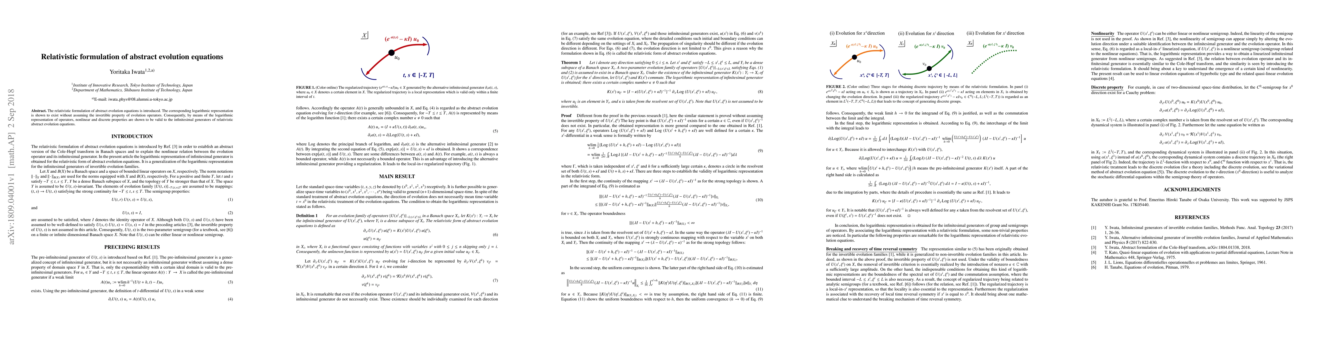 The relativistic formulation of abstract evolution equations is introduced. The corresponding logarithmic representation is shown to exist without assuming the invertible property of evolution operators. Consequently, by means of the logarithmic representation of operators, nonlinear and discrete properties are shown to be valid to the infinitesimal generators of relativistic abstract evolution equations.