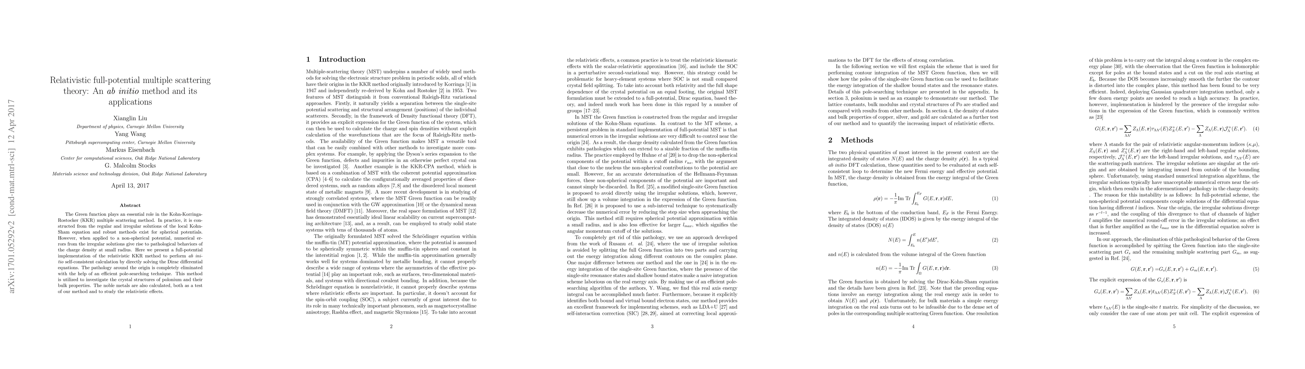 The Green function plays an essential role in the Kohn-Korringa-Rostocker (KKR) multiple scattering method. In practice, it is constructed from the regular and irregular solutions of the local Kohn-Sham equation and robust methods exist for spherical potentials. However, when applied to a non-spherical potential, numerical errors from the irregular solutions give rise to pathological behaviors of the charge density at small radius. Here we present a full-potential implementation of the relativistic KKR method to perform \textit{ab initio} self-consistent calculation by directly solving the Dirac differential equations. The pathology around the origin is completely eliminated with the help of an efficient pole-searching technique. This method is utilized to investigate the crystal structures of polonium and their bulk properties. The noble metals are also calculated, both as a test of our method and to study the relativistic effects.