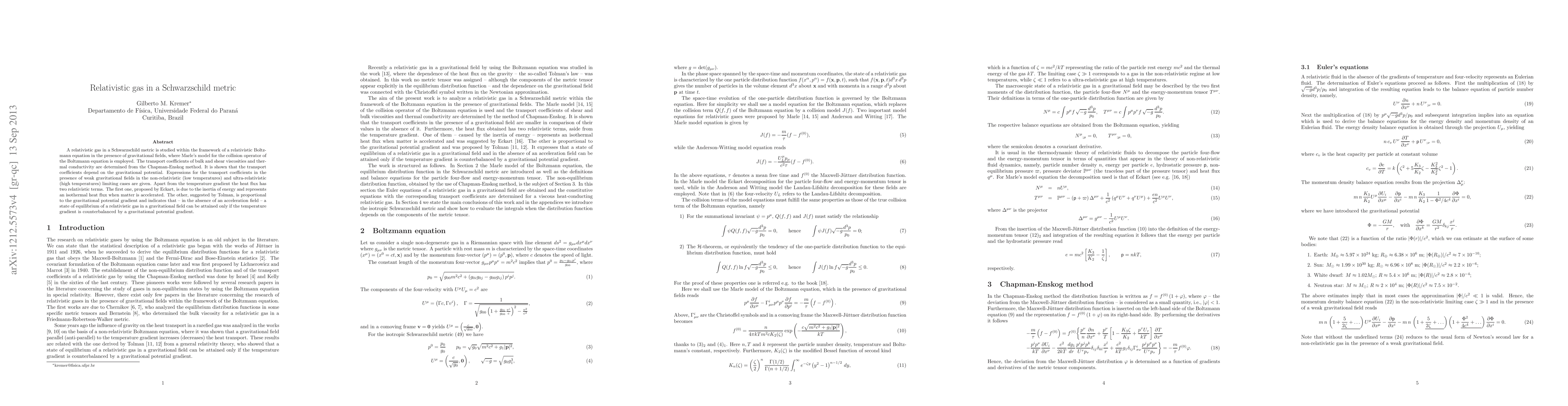 This paper studies relativistic gases under a Schwarzschild metric using a relativistic Boltzmann equation, determining transport coefficients like bulk viscosity, shear viscosity, and thermal conductivity via the Chapman-Enskog method. It finds these coefficients vary with gravitational potential, and introduces relativistic heat flux terms due to Eckart and Tolman, highlighting the influence of gravitational fields on relativistic gas equilibrium.