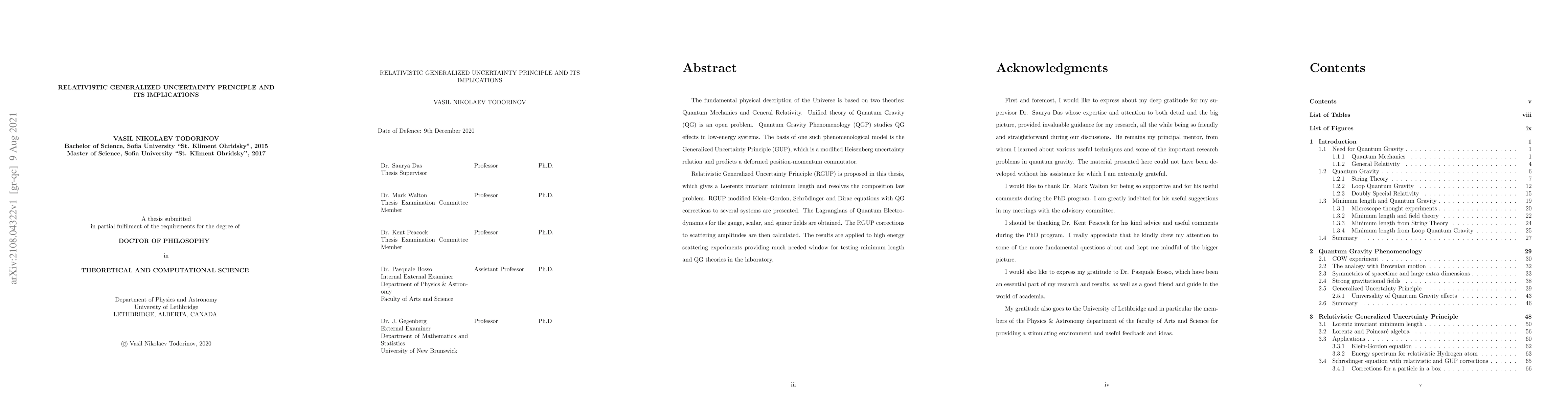 The fundamental physical description of the Universe is based on two theories: Quantum Mechanics and General Relativity. Unified theory of Quantum Gravity (QG) is an open problem. Quantum Gravity Phenomenology (QGP) studies QG effects in low-energy systems. The basis of one such phenomenological model is the Generalized Uncertainty Principle (GUP), which is a modified Heisenberg uncertainty relation and predicts a deformed position-momentum commutator. Relativistic Generalized Uncertainty Principle (RGUP) is proposed in this thesis, which gives a Loerentz invariant minimum length and resolves the composition law problem. RGUP modified Klein-Gordon, Schrodinger and Dirac equations with QG corrections to several systems are presented. The Lagrangians of Quantum Electrodynamics for the gauge, scalar, and spinor fields are obtained. The RGUP corrections to scattering amplitudes are then calculated. The results are applied to high energy scattering experiments providing much needed window for testing minimum length and QG theories in the laboratory.