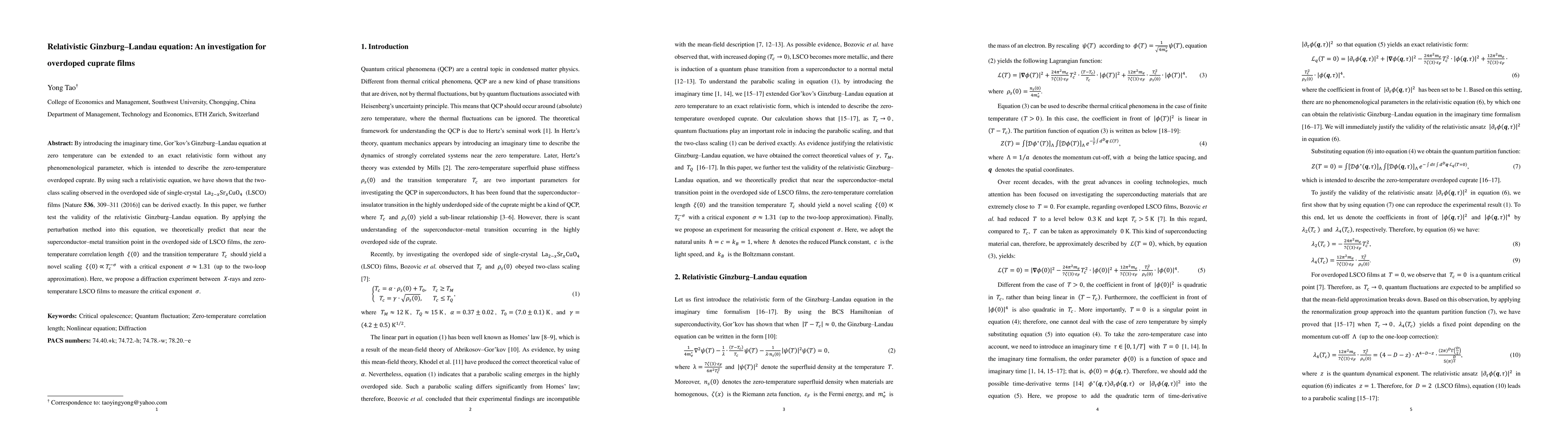 Researchers developed a relativistic Ginzburg-Landau equation to describe overdoped cuprate films, predicting a novel scaling between correlation length and transition temperature with a critical exponent of approximately 1.31.