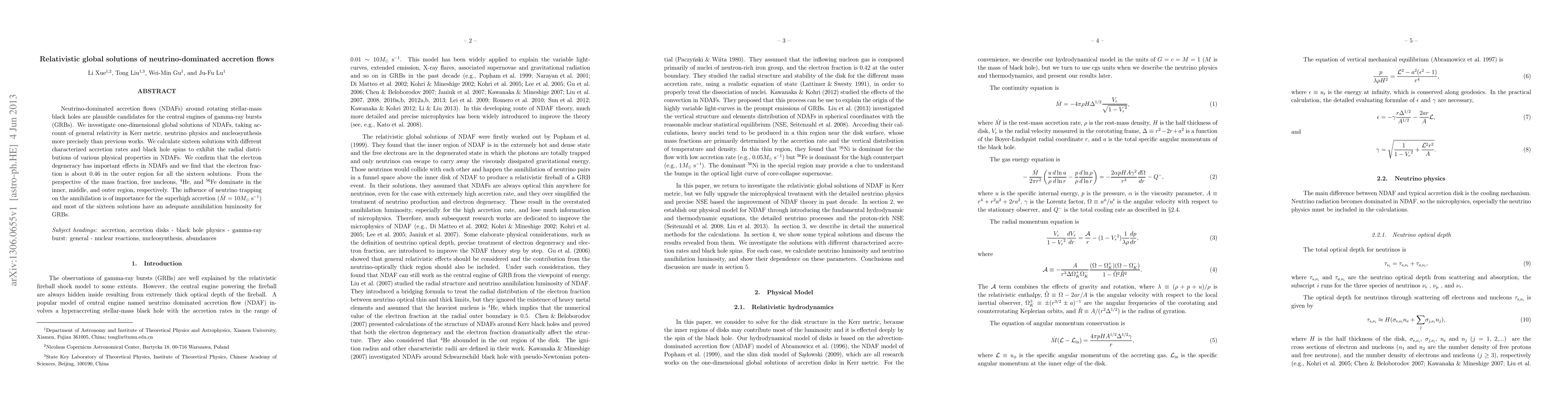 This paper investigates relativistic global solutions of neutrino-dominated accretion flows (NDAFs) around rotating black holes, considering general relativity and detailed neutrino physics. It finds that the electron fraction is approximately 0.46 in the outer region and that neutrino trapping significantly impacts high accretion rates, potentially powering gamma-ray bursts.