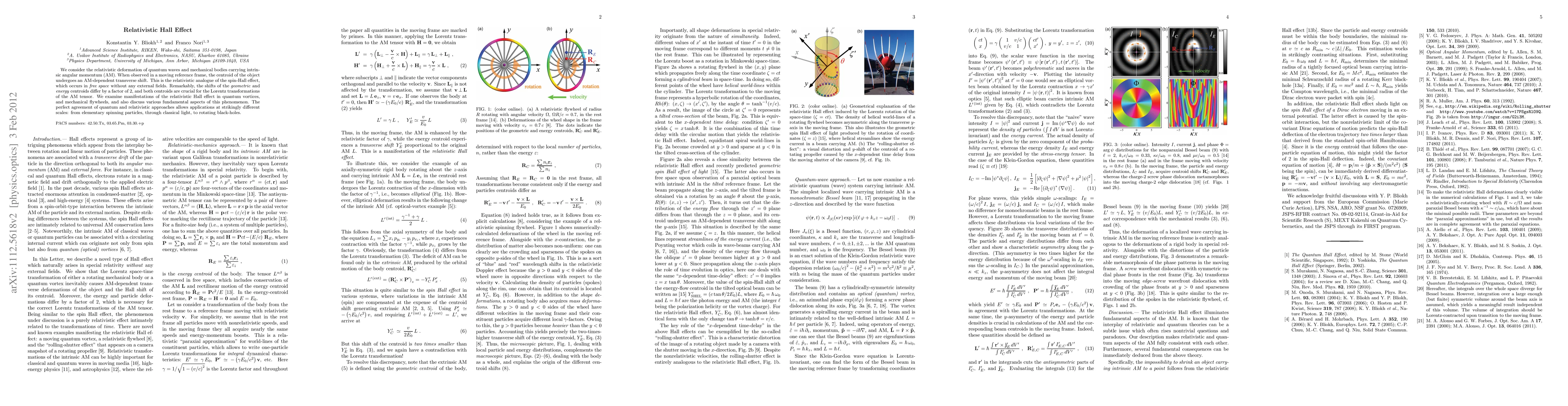 We consider the relativistic deformation of quantum waves and mechanical bodies carrying intrinsic angular momentum (AM). When observed in a moving reference frame, the centroid of the object undergoes an AM-dependent transverse shift. This is the relativistic analogue of the spin Hall effect, which occurs in free space without any external fields. Remarkably, the shifts of the geometric and energy centroids differ by a factor of 2, and both centroids are crucial for the correct Lorentz transformations of the AM tensor. We examine manifestations of the relativistic Hall effect in quantum vortices, and mechanical flywheels, and also discuss various fundamental aspects of this phenomenon. The perfect agreement of quantum and relativistic approaches allows applications at strikingly different scales: from elementary spinning particles, through classical light, to rotating black-holes.
