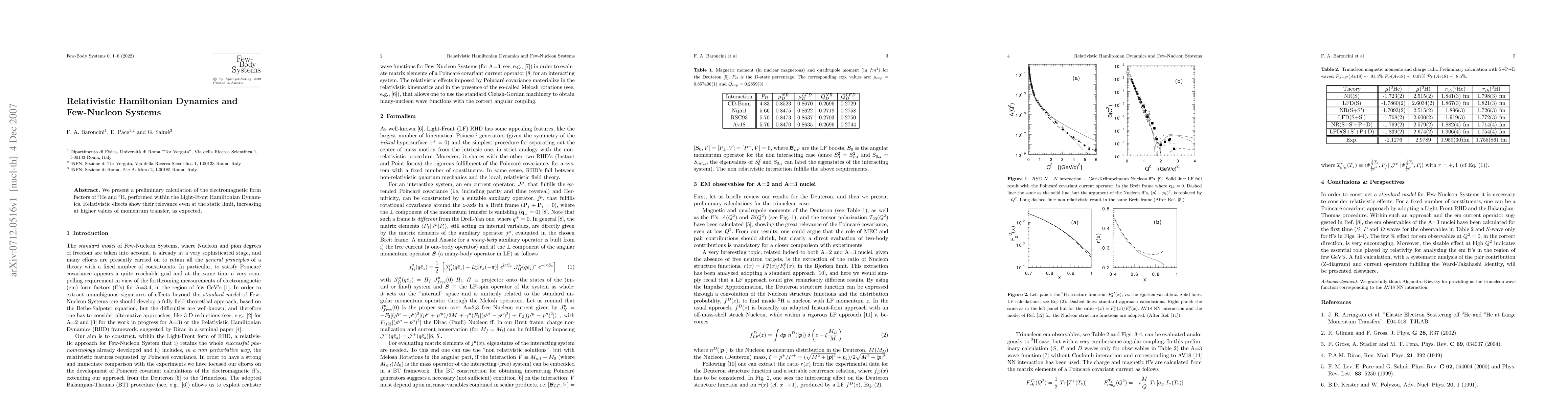 We present a preliminary calculation of the electromagnetic form factors of $^3$He and $^3$H, performed within the Light-Front Hamiltonian Dynamics. Relativistic effects show their relevance even at the static limit, increasing at higher values of momentum transfer, as expected.
