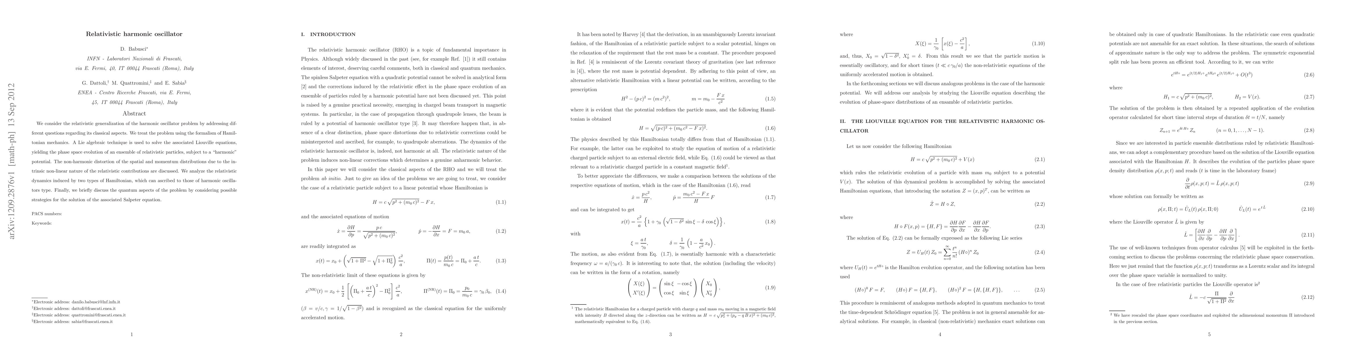 This paper investigates the relativistic generalization of the harmonic oscillator using Hamiltonian mechanics and Lie algebraic techniques to analyze the phase space evolution and non-harmonic distortions in relativistic particles under a harmonic potential. It also explores the dynamics of two Hamiltonian types and briefly mentions strategies for solving the associated quantum problem via the Salpeter equation.