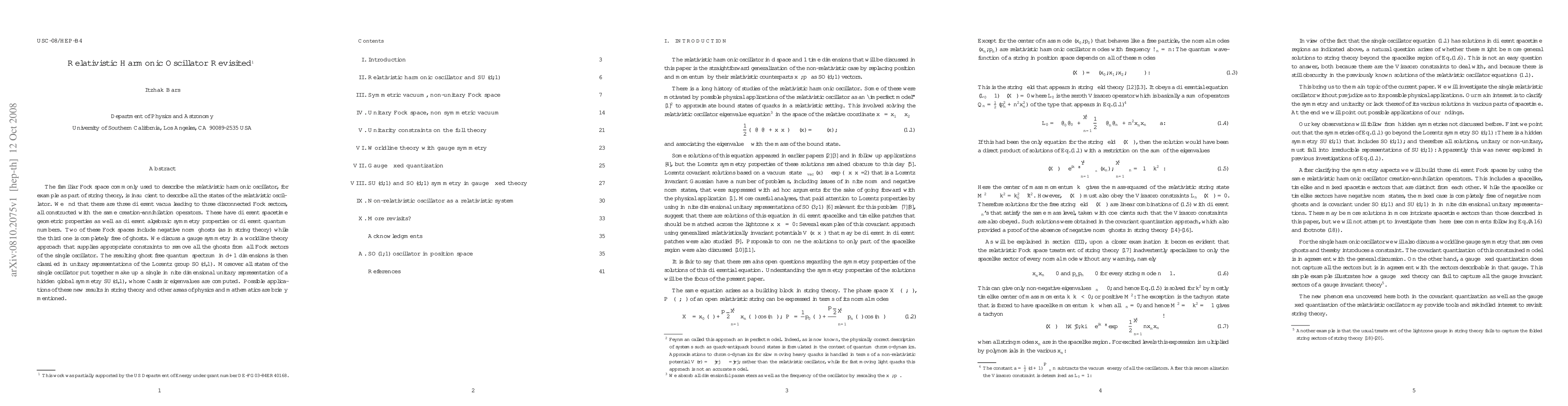 This paper identifies three distinct Fock sectors for the relativistic harmonic oscillator, each with unique geometric and algebraic properties, including the presence of negative norm ghosts in two sectors. A gauge symmetry is proposed to eliminate these ghosts, leading to a ghost-free quantum spectrum classified by unitary representations of the Lorentz group.