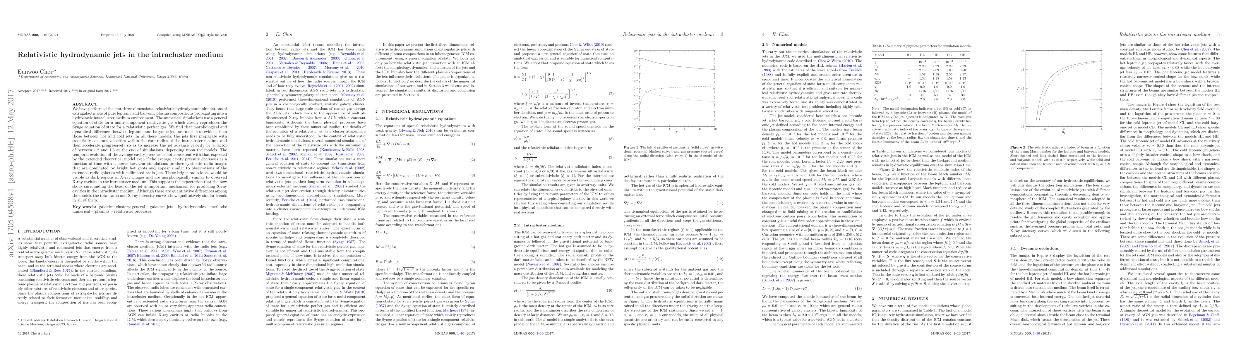 This study presents the first three-dimensional relativistic hydrodynamic simulations of leptonic and baryonic jets in an intracluster medium, revealing that jets accelerate progressively and produce synthetic radio images with bright hot spots. The simulations support the role of bow shocks in forming X-ray cavities, though discrepancies exist between theoretical models and observed cavity pressure evolution.