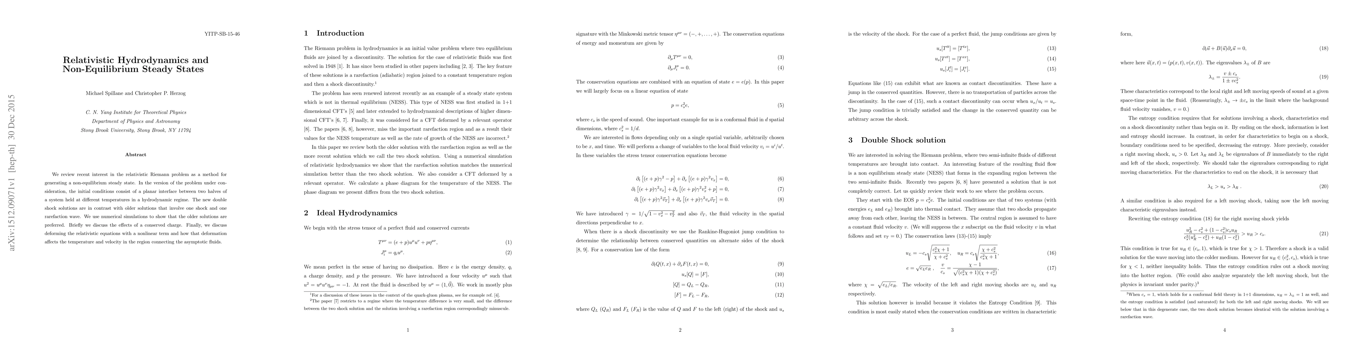 We review recent interest in the relativistic Riemann problem as a method for generating a non-equilibrium steady state. In the version of the problem under con- sideration, the initial conditions consist of a planar interface between two halves of a system held at different temperatures in a hydrodynamic regime. The new double shock solutions are in contrast with older solutions that involve one shock and one rarefaction wave. We use numerical simulations to show that the older solutions are preferred. Briefly we discuss the effects of a conserved charge. Finally, we discuss deforming the relativistic equations with a nonlinear term and how that deformation affects the temperature and velocity in the region connecting the asymptotic fluids.
