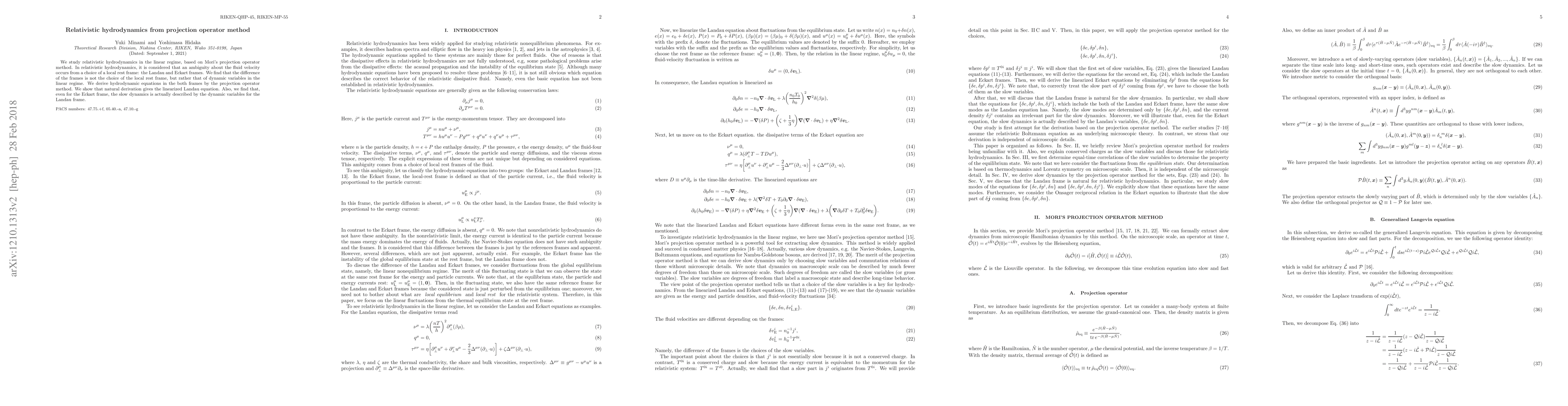 This paper explores relativistic hydrodynamics using Mori's projection operator method, revealing that the difference between the Landau and Eckart frames lies in dynamic variables rather than local rest frames. It derives hydrodynamic equations for both frames and shows that the linearized Landau equation is naturally derived, while the Eckart frame still describes slow dynamics via Landau-like variables.
