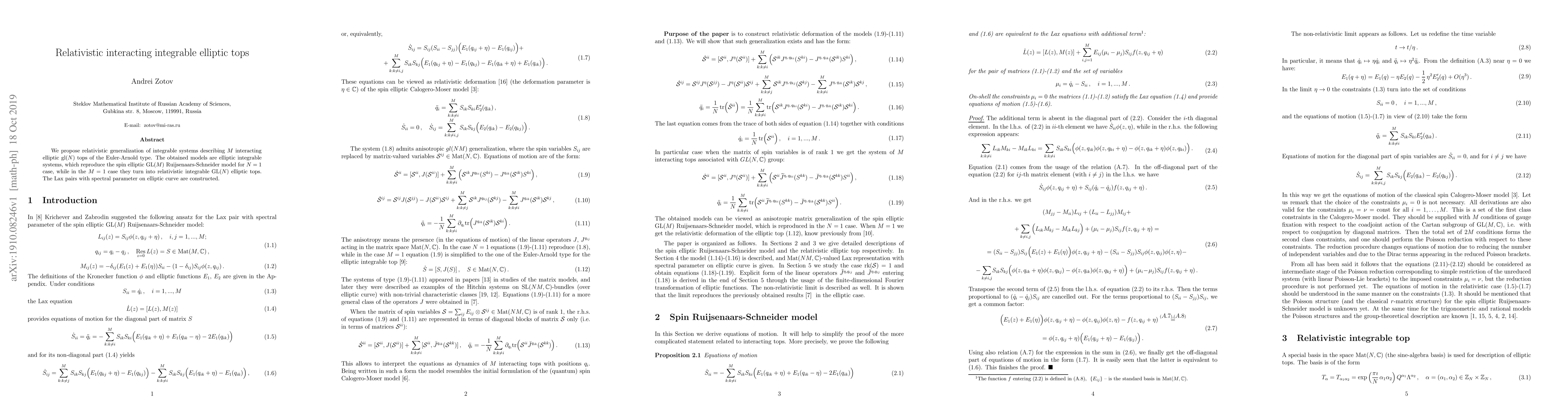 This paper generalizes relativistic integrable systems to describe $M$ interacting elliptic ${\rm gl}(N)$ tops, constructing Lax pairs with spectral parameters on elliptic curves. The models reproduce the spin elliptic ${\rm GL}(M)$ Ruijsenaars-Schneider model for $N=1$ and transform into relativistic integrable ${\rm GL}(N)$ elliptic tops for $M=1$.