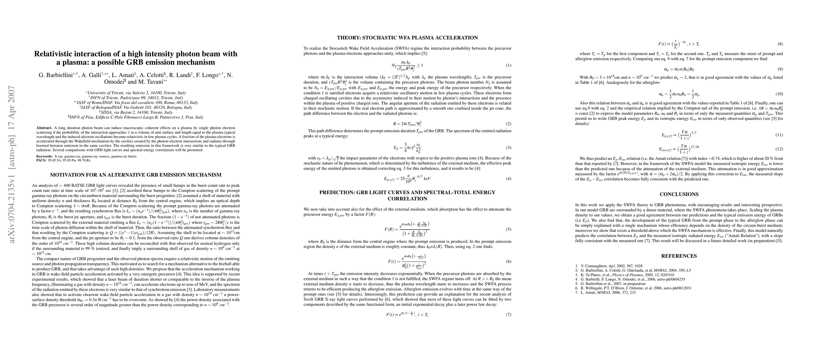 A long duration photon beam can induce macroscopic coherent effects on a plasma by single photon electron scattering if the probability of the interaction approaches 1 in a volume of unit surface and length equal to the plasma typical wavelength, and the induced electron oscillations become relativistic in few plasma cycles. A fraction of the plasma electrons is accelerated through the Wakefield mechanism by the cavities created by the photon-electron interactions and radiates through boosted betraton emission in the same cavities. The resulting emission in this framework is very similar to the typical GRB radiation. Several comparisons with GRB light curves and spectral-energy correlations will be presented.