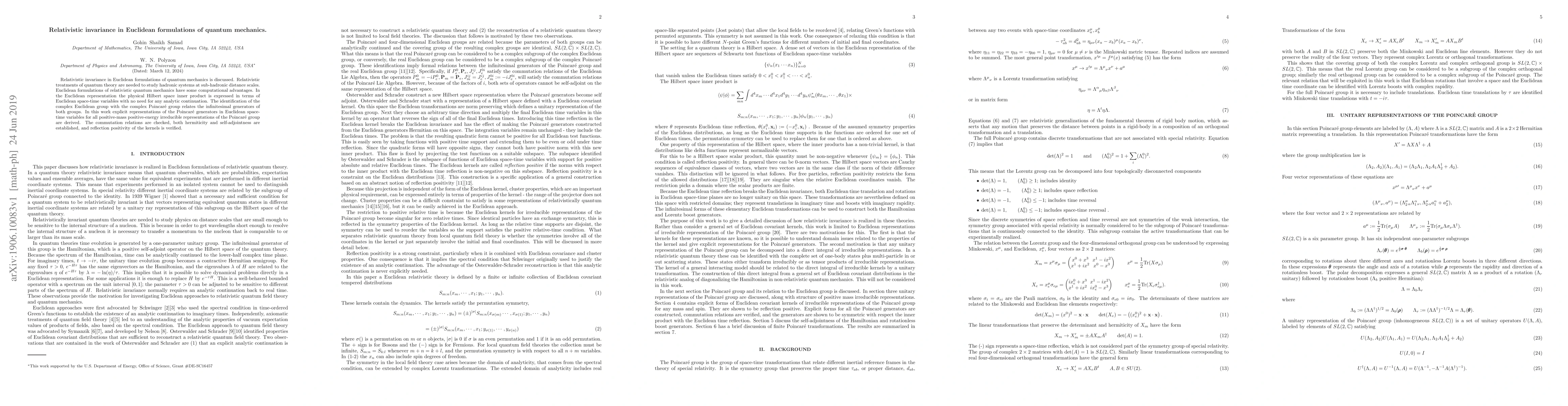 This paper explores relativistic invariance in quantum mechanics within Euclidean formulations, deriving explicit representations of the Poincaré generators in Euclidean space-time. It verifies commutation relations, hermiticity, self-adjointness, and reflection positivity for these representations.