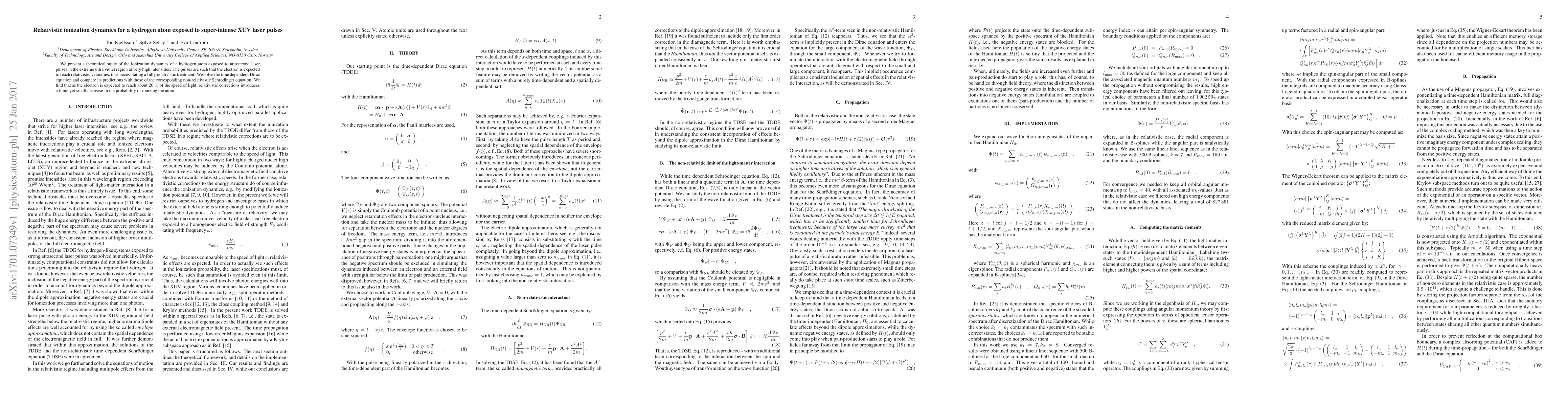This paper investigates the relativistic ionization dynamics of a hydrogen atom under extreme ultra violet (XUV) laser pulses using the time-dependent Dirac equation. It finds that while relativistic effects cause a minor decrease in ionization probability, the electron reaches about 20% of the speed of light, necessitating a relativistic treatment.