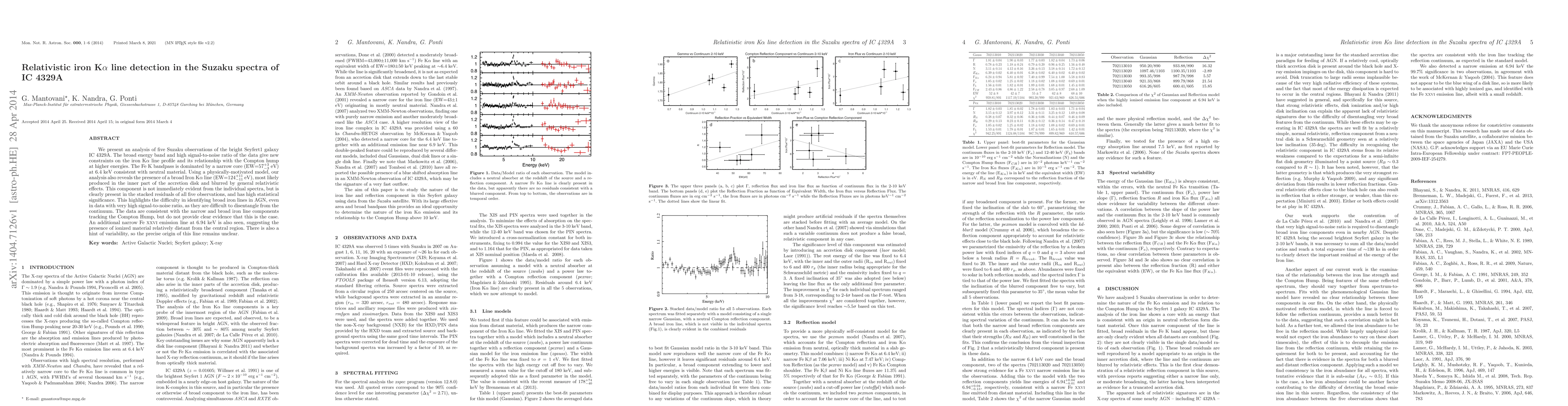 We present an analysis of five Suzaku observations of the bright Seyfert1 galaxy IC 4329A. The broad energy band and high signal-to-noise ratio of the data give new constraints on the iron K alpha line profile and its relationship with the Compton hump at higher energies. The Fe K bandpass is dominated by a narrow core (EW=57 eV) at 6.4 keV consistent with neutral material. Using a physically-motivated model, our analysis also reveals the presence of a broad Iron K alpha line (EW=124 eV), most likely produced in the inner part of the accretion disk and blurred by general relativistic effects. This component is not immediately evident from the individual spectra, but is clearly present in the stacked residuals of all five observations, and has high statistical significance. This highlights the difficulty in identifying broad iron lines in AGN, even in data with very high signal-to-noise ratio, as they are difficult to disentangle from the continuum. The data are consistent with the narrow and broad iron line components tracking the Compton Hump, but do not provide clear evidence that this is the case. An additional narrow FeXXVI emission line at 6.94 keV is also seen, suggesting the presence of ionized material relatively distant from the central region. There is also a hint of variability, so the precise origin of this line remains unclear.