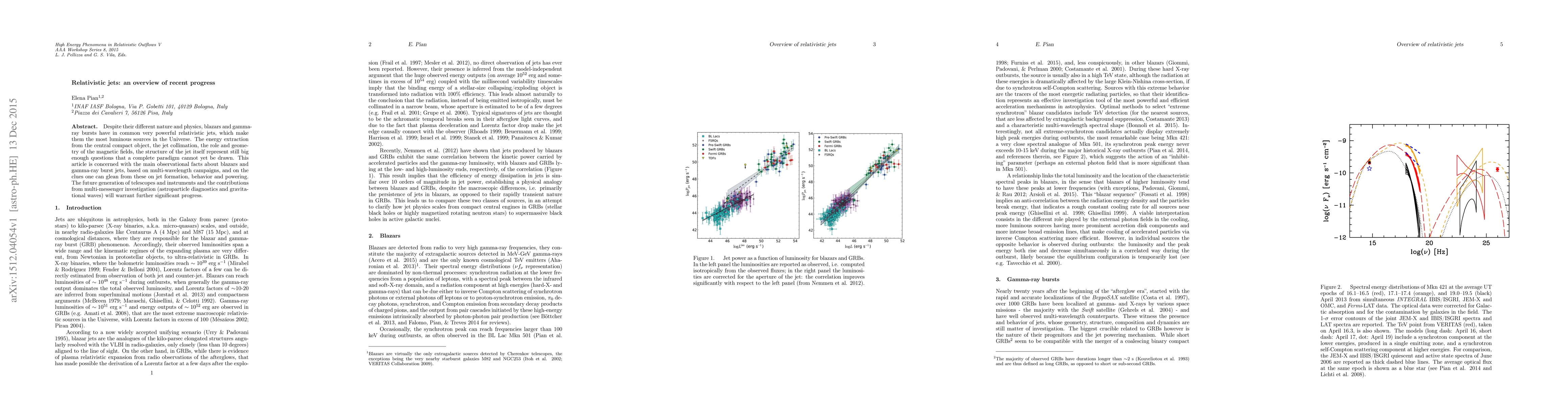 Despite their different nature and physics, blazars and gamma-ray bursts have in common very powerful relativistic jets, which make them the most luminous sources in the Universe. The energy extraction from the central compact object, the jet collimation, the role and geometry of the magnetic fields, the structure of the jet itself represent still big enough questions, that a complete paradigm cannot yet be drawn. This article is concerned with the main observational facts about blazars and gamma-ray burst jets, based on multi-wavelength campaigns, and on the clues one can glean from these on jet formation, behavior and powering. The future generation of telescopes and instruments and the contributions from multi-messenger investigation (astroparticle diagnostics and gravitational waves) will warrant further significant progress.
