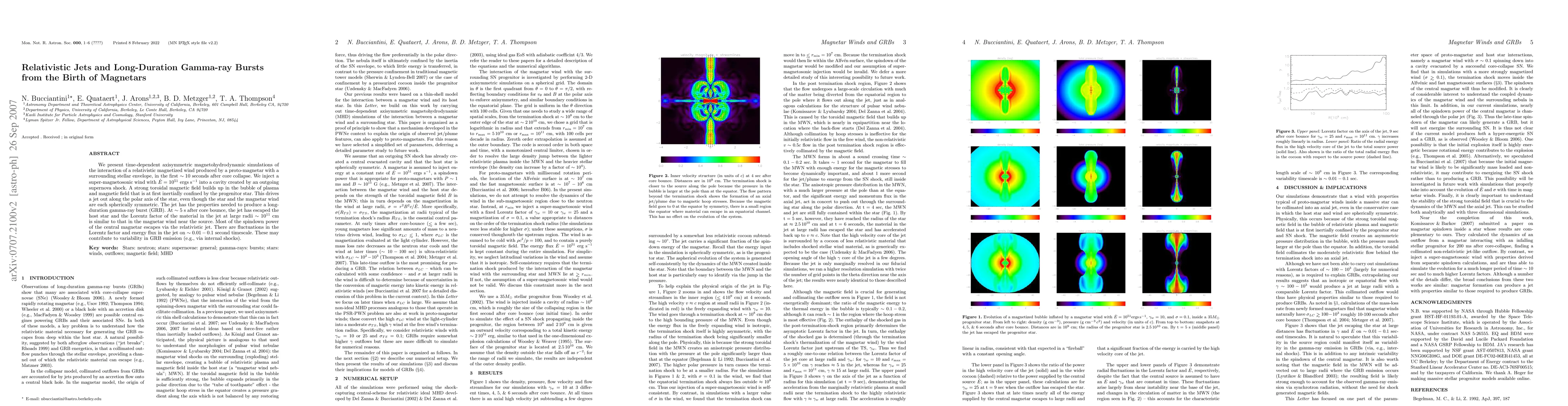 This paper presents simulations of relativistic jets from proto-magnetars interacting with a stellar envelope, showing that such jets can produce long-duration gamma-ray bursts (GRBs). The study finds that fluctuations in the jet's properties may cause variability in GRB emissions.