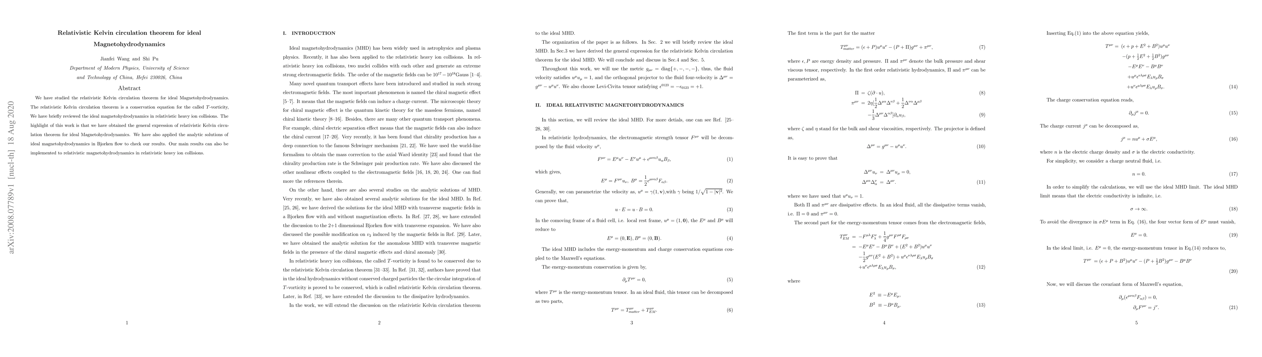 This paper derives the relativistic Kelvin circulation theorem for ideal Magnetohydrodynamics, focusing on the conservation of $T$-vorticity. The authors apply their findings to Bjorken flow, demonstrating applicability to relativistic heavy ion collisions.