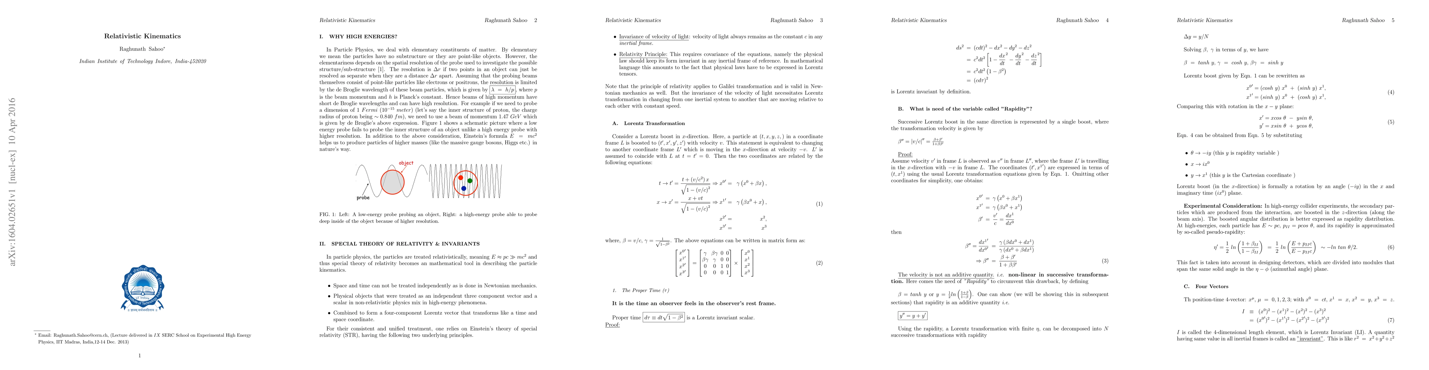This lecture note covers Relativistic Kinematics, which is very useful for the beginners in the field of high-energy physics. A very practical approach has been taken, which answers "why and how" of the kinematics useful for students working in the related areas.