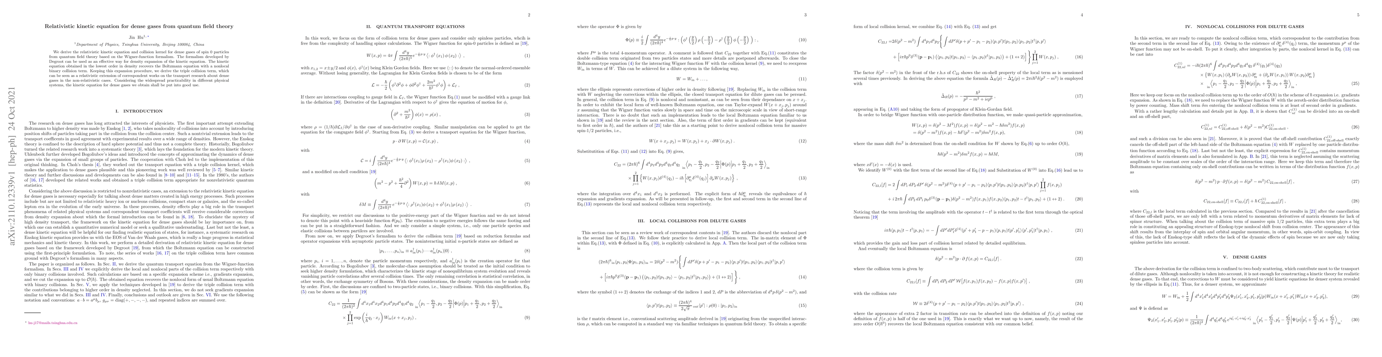 This paper derives a relativistic kinetic equation and collision kernel for dense gases of spin 0 particles using quantum field theory and the Wigner-function formalism. It extends the Degroot formalism to include relativistic effects, recovering the Boltzmann equation with a nonlocal collision term in lowest density order, and introduces a triple collision term for transport research applicable to various physical systems.
