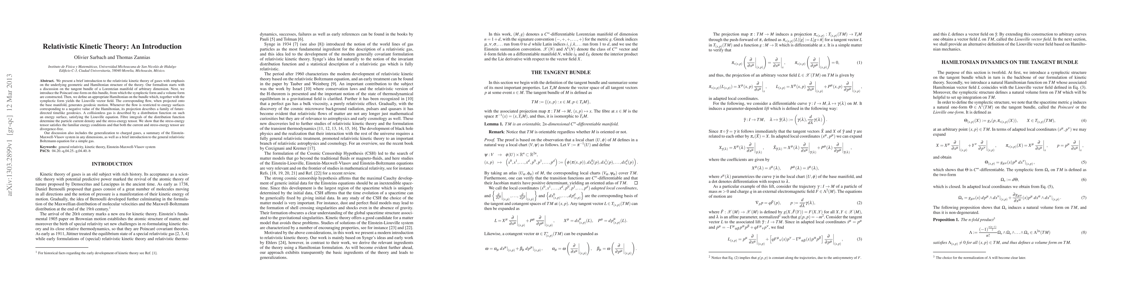 This paper introduces relativistic kinetic theory, focusing on its geometric and Hamiltonian framework. It constructs the theory using the tangent bundle of a Lorentzian manifold, defines a Hamiltonian, and derives the Liouville vector field, leading to the description of geodesic motion and the behavior of collisionless gases. The paper also extends the discussion to charged gases and briefly touches on the Einstein-Maxwell-Vlasov system.