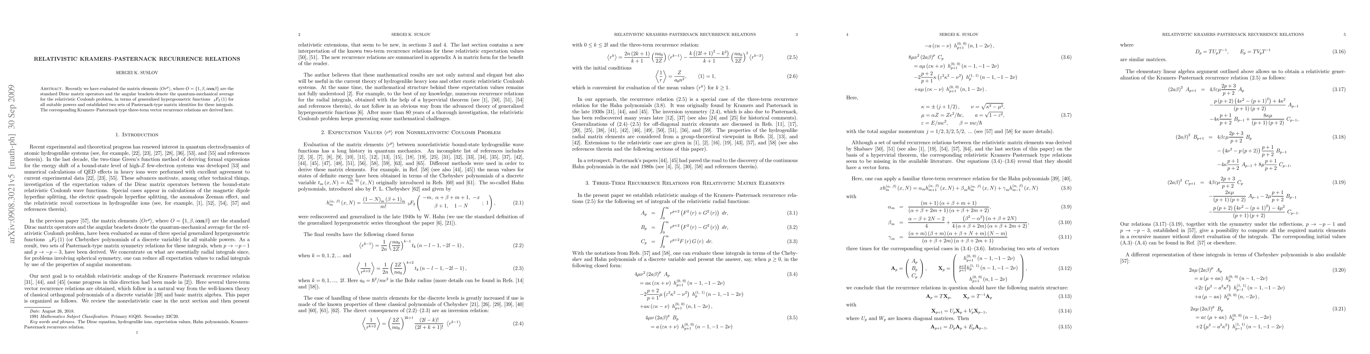 This paper evaluates matrix elements for the relativistic Coulomb problem using generalized hypergeometric functions and establishes two sets of Pasternack-type matrix identities. It also derives corresponding Kramers-Pasternack three-term vector recurrence relations.