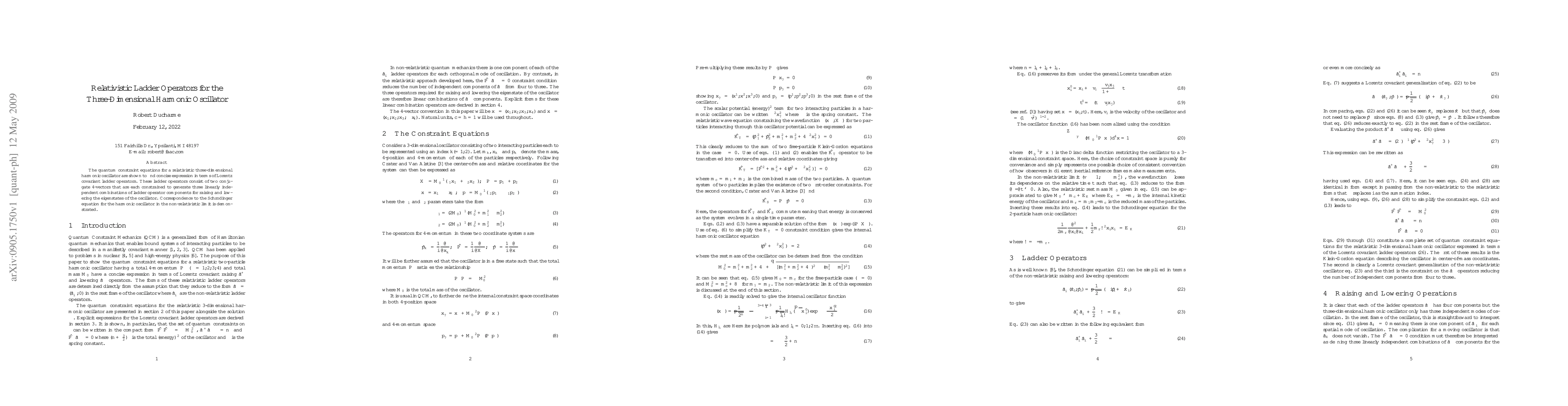 This paper introduces Lorentz covariant ladder operators for a relativistic three-dimensional harmonic oscillator, demonstrating their ability to succinctly express quantum constraint equations. The correspondence to the non-relativistic Schrödinger equation is also shown in the appropriate limit.
