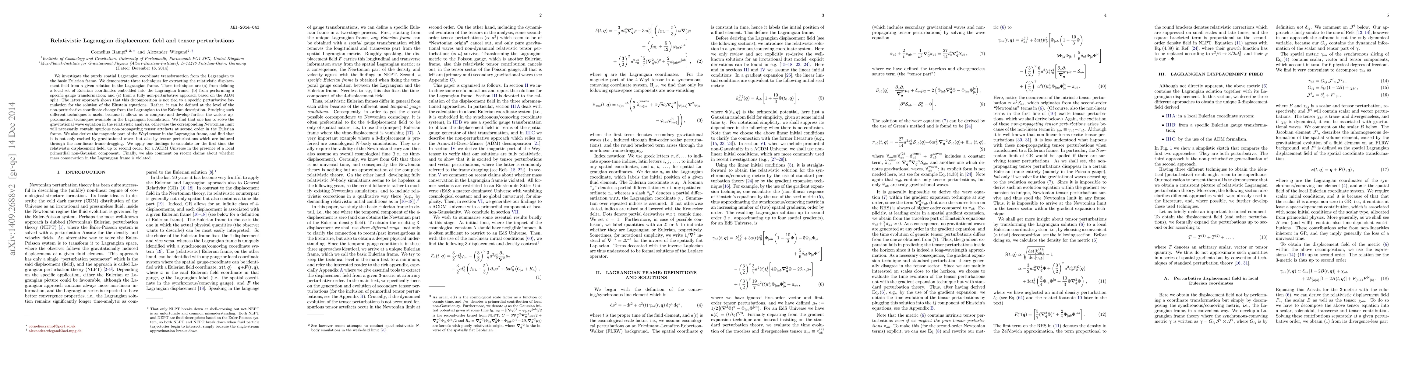 We investigate the purely spatial Lagrangian coordinate transformation from the Lagrangian to the basic Eulerian frame. We demonstrate three techniques for extracting the relativistic displacement field from a given solution in the Lagrangian frame. These techniques are (a) from defining a local set of Eulerian coordinates embedded into the Lagrangian frame; (b) from performing a specific gauge transformation; and (c) from a fully non-perturbative approach based on the ADM split. The latter approach shows that this decomposition is not tied to a specific perturbative formulation for the solution of the Einstein equations. Rather, it can be defined at the level of the non-perturbative coordinate change from the Lagrangian to the Eulerian description. Studying such different techniques is useful because it allows us to compare and develop further the various approximation techniques available in the Lagrangian formulation. We find that one has to solve the gravitational wave equation in the relativistic analysis, otherwise the corresponding Newtonian limit will necessarily contain spurious non-propagating tensor artefacts at second order in the Eulerian frame. We also derive the magnetic part of the Weyl tensor in the Lagrangian frame, and find that it is not only excited by gravitational waves but also by tensor perturbations which are induced through the non-linear frame-dragging. We apply our findings to calculate for the first time the relativistic displacement field, up to second order, for a $\Lambda$CDM Universe in the presence of a local primordial non-Gaussian component. Finally, we also comment on recent claims about whether mass conservation in the Lagrangian frame is violated.