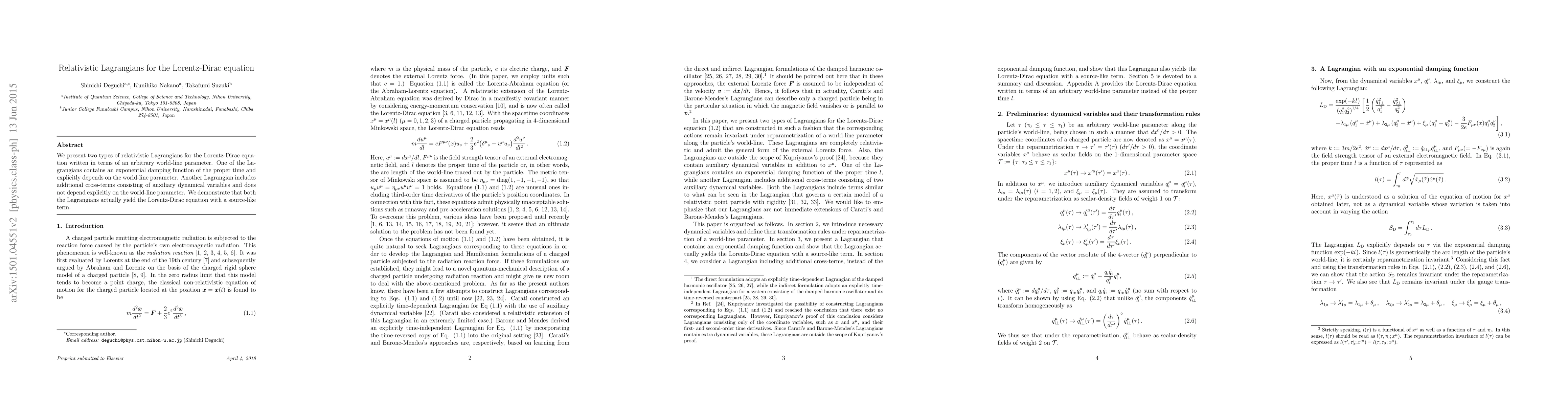 This paper introduces two distinct relativistic Lagrangians for the Lorentz-Dirac equation, each formulated with different dependencies on the world-line parameter, and shows they both reproduce the Lorentz-Dirac equation with a source-like term.