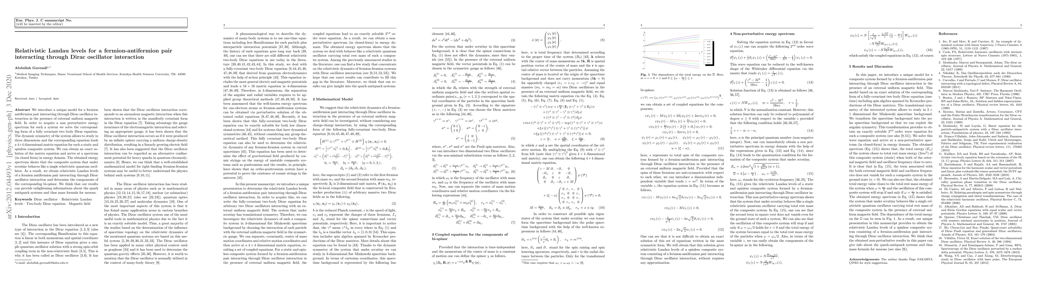 We introduce a unique model for a fermion antifermion pair interacting through Dirac oscillator interaction in the presence of external uniform magnetic field. In order to acquire a non perturbative energy spectrum for such a system we solve the corresponding form of a fully covariant two body Dirac equation. The dynamic symmetry of the system allows to study in three dimensions and the corresponding equation leads a $4\times4$ dimensional matrix equation for such a static and spinless composite system. We can obtain an exact solution of the matrix equation and arrive at a spectrum (in closed form) in energy domain. The obtained energy spectrum shows that the composite system that under scrutiny behaves like a single relativistic quantum oscillator. As a result, we obtain relativistic Landau levels of a fermion antifermion pair interacting through Dirac oscillator interaction and determine the components of the corresponding bi-spinor. We think that our results can provide enlightening informations about the quark antiquark systems and thus mass formula for mesons.