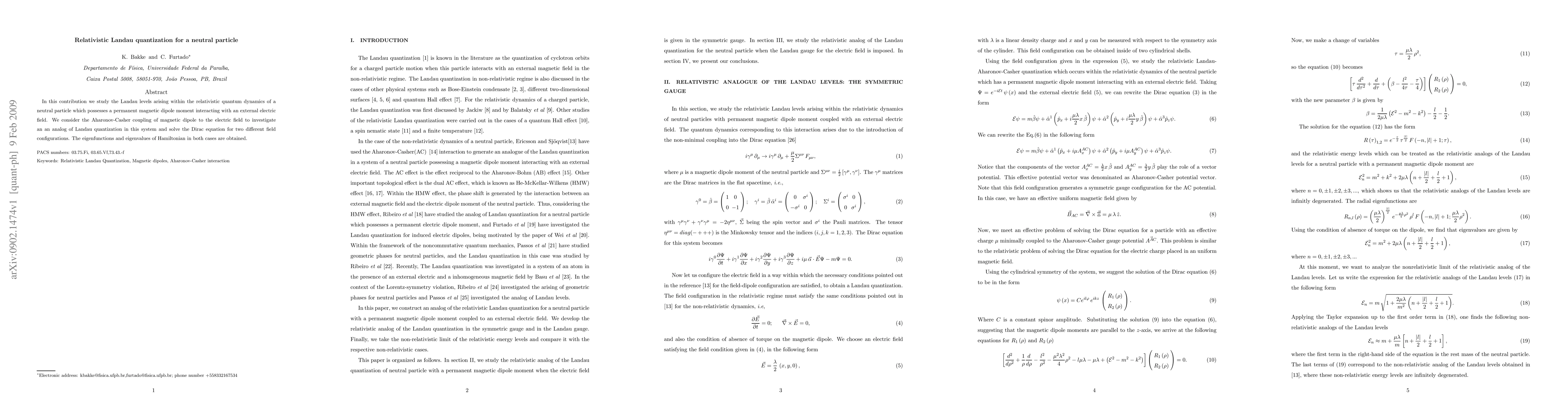 In this contribution we study the Landau levels arising within the relativistic quantum dynamics of a neutral particle which possesses a permanent magnetic dipole moment interacting with an external electric field. We consider the Aharonov-Casher coupling of magnetic dipole to the electric field to investigate an an analog of Landau quantization in this system and solve the Dirac equation for two different field configurations. The eigenfunctions and eigenvalues of Hamiltonian in both cases are obtained.