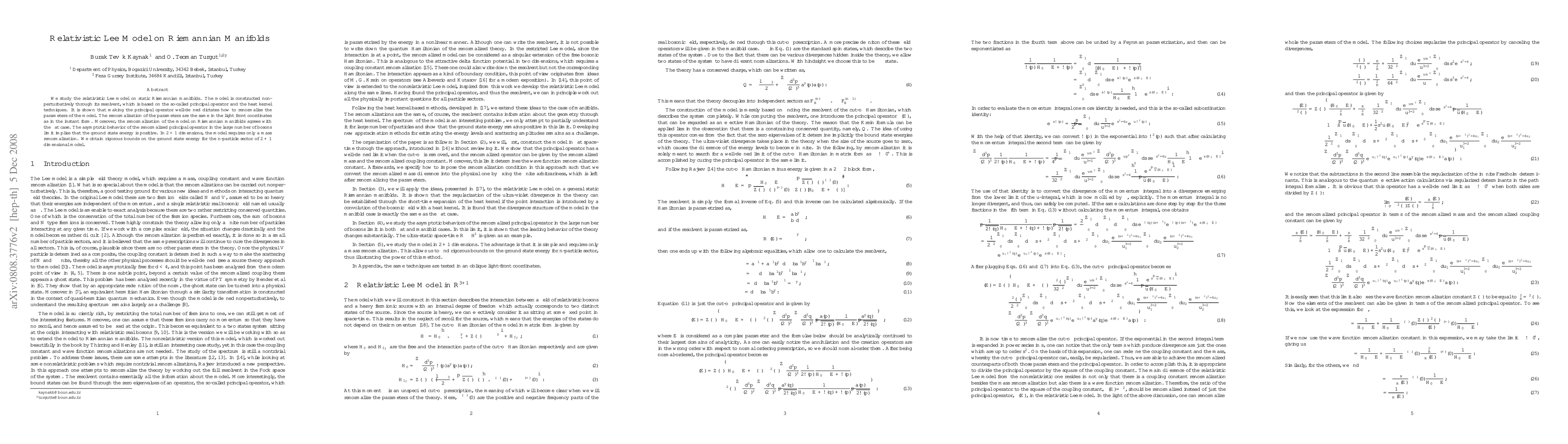 This paper constructs the relativistic Lee model on static Riemannian manifolds using nonperturbative methods, showing that renormalization of model parameters is consistent across different coordinate systems and matches the flat space case. It establishes rigorous bounds on the ground state energy in the 2+1 dimensional model, confirming positive energy in the large boson limit.