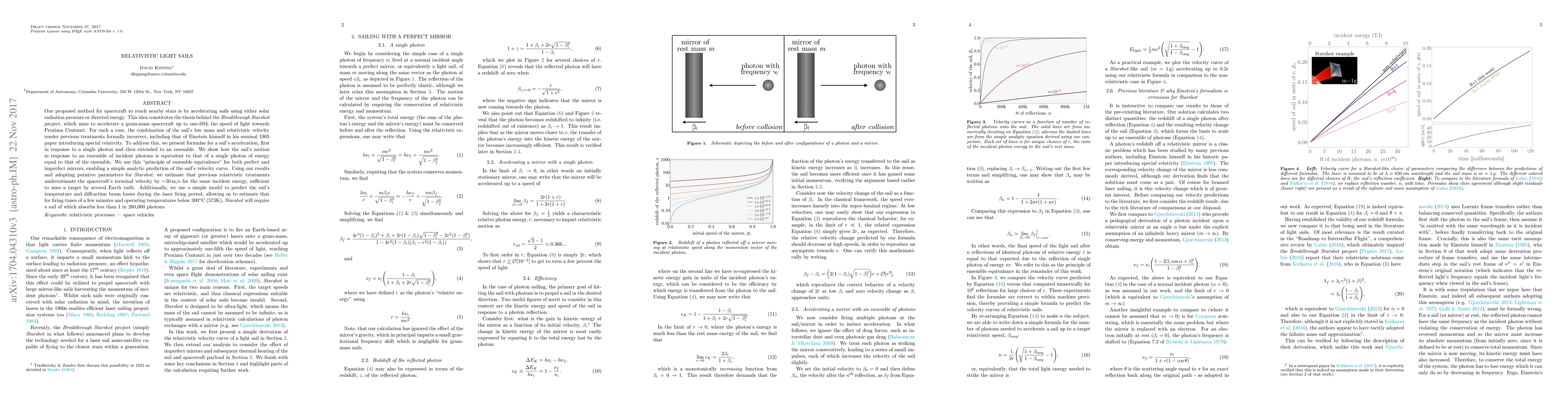 One proposed method for spacecraft to reach nearby stars is by accelerating sails using either solar radiation pressure or directed energy. This idea constitutes the thesis behind the Breakthrough Starshot project, which aims to accelerate a gram-mass spacecraft up to one-fifth the speed of light towards Proxima Centauri. For such a case, the combination of the sail's low mass and relativistic velocity render previous treatments formally incorrect, including that of Einstein himself in his seminal 1905 paper introducing special relativity. To address this, we present formulae for a sail's acceleration, first in response to a single photon and then extended to an ensemble. We show how the sail's motion in response to an ensemble of incident photons is equivalent to that of a single photon of energy equal to that of the ensemble. We use this 'principle of ensemble equivalence' for both perfect and imperfect mirrors, enabling a simple analytic prediction of the sail's velocity curve. Using our results and adopting putative parameters for Starshot, we estimate that previous relativistic treatments underestimate the spacecraft's terminal velocity by ~50m/s for the same incident energy, sufficient to miss a target by several Earth radii. Additionally, we use a simple model to predict the sail's temperature and diffraction beam losses during the laser firing period, allowing us to estimate that for firing times of a few minutes and operating temperatures below 300C (573K), Starshot will require a sail of which absorbs less than 1 in 260,000 photons.
