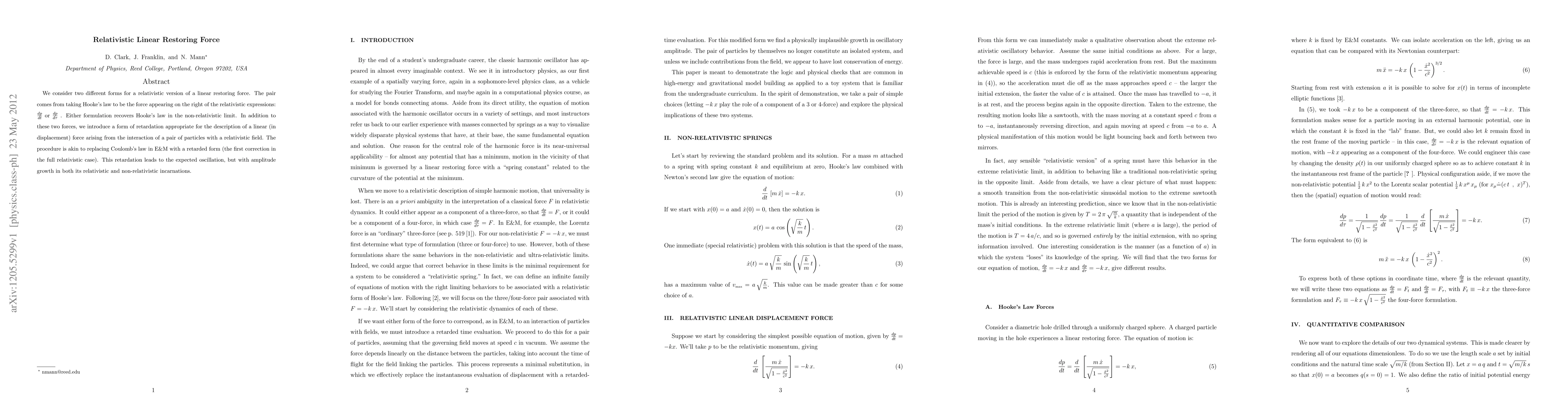 The research explores relativistic linear restoring forces by considering two forms derived from Hooke's law in relativistic expressions: dp/dt and dp/dtau. It also introduces a retardation form for particle interaction with a relativistic field, akin to retarded Coulomb's law in E&M.