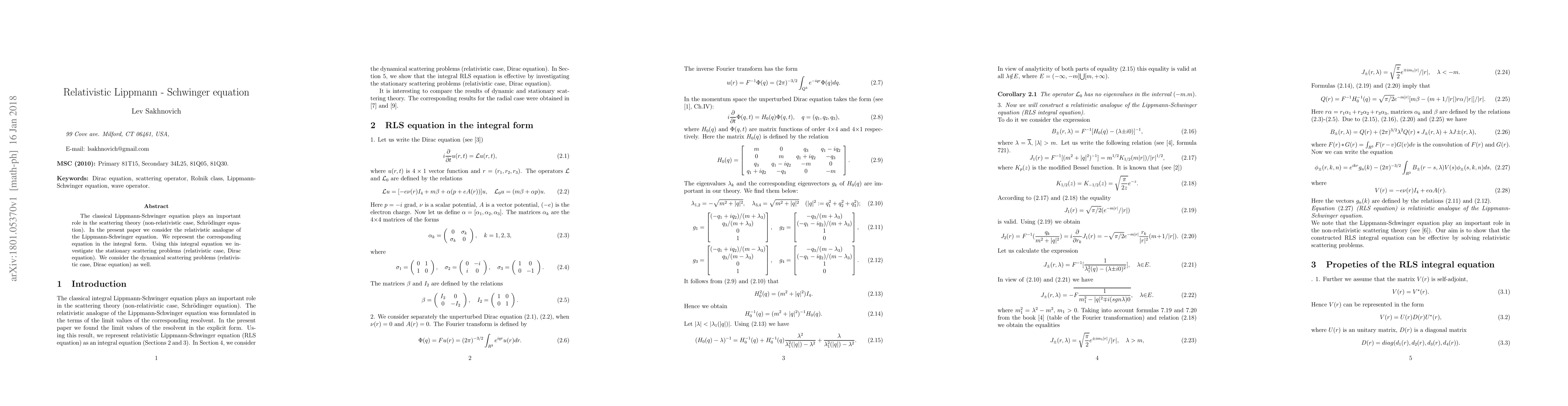 The paper presents the relativistic analogue of the Lippmann-Schwinger equation in integral form, applied to scattering problems in the relativistic case using the Dirac equation for both stationary and dynamical scenarios.