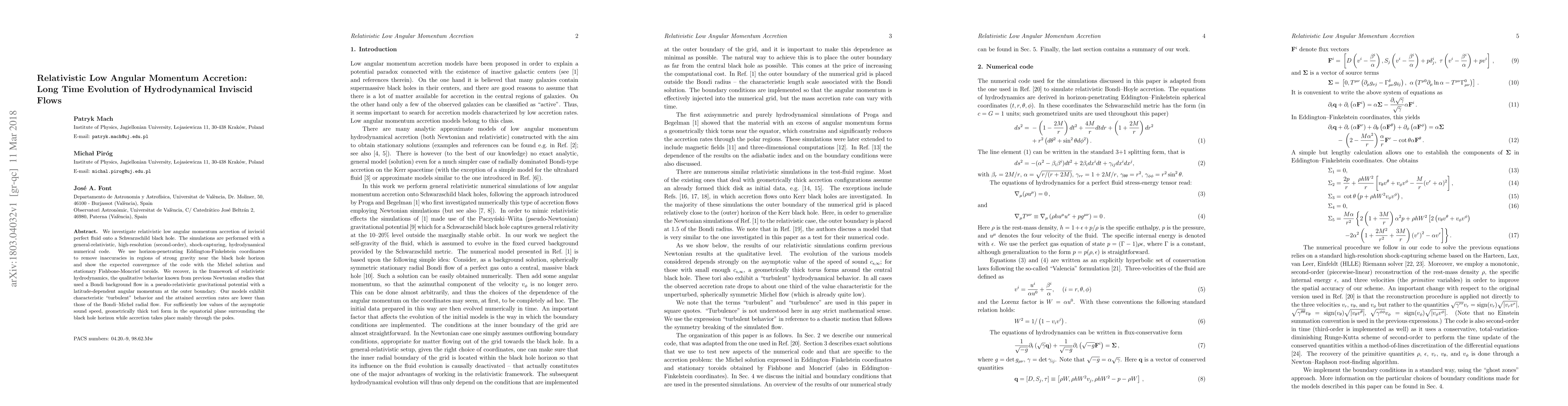 We investigate relativistic low angular momentum accretion of inviscid perfect fluid onto a Schwarzschild black hole. The simulations are performed with a general-relativistic, high-resolution (second-order), shock-capturing, hydrodynamical numerical code. We use horizon-penetrating Eddington-Finkelstein coordinates to remove inaccuracies in regions of strong gravity near the black hole horizon and show the expected convergence of the code with the Michel solution and stationary Fishbone-Moncrief toroids. We recover, in the framework of relativistic hydrodynamics, the qualitative behavior known from previous Newtonian studies that used a Bondi background flow in a pseudo-relativistic gravitational potential with a latitude-dependent angular momentum at the outer boundary. Our models exhibit characteristic "turbulent" behavior and the attained accretion rates are lower than those of the Bondi-Michel radial flow. For sufficiently low values of the asymptotic sound speed, geometrically thick tori form in the equatorial plane surrounding the black hole horizon while accretion takes place mainly through the poles.