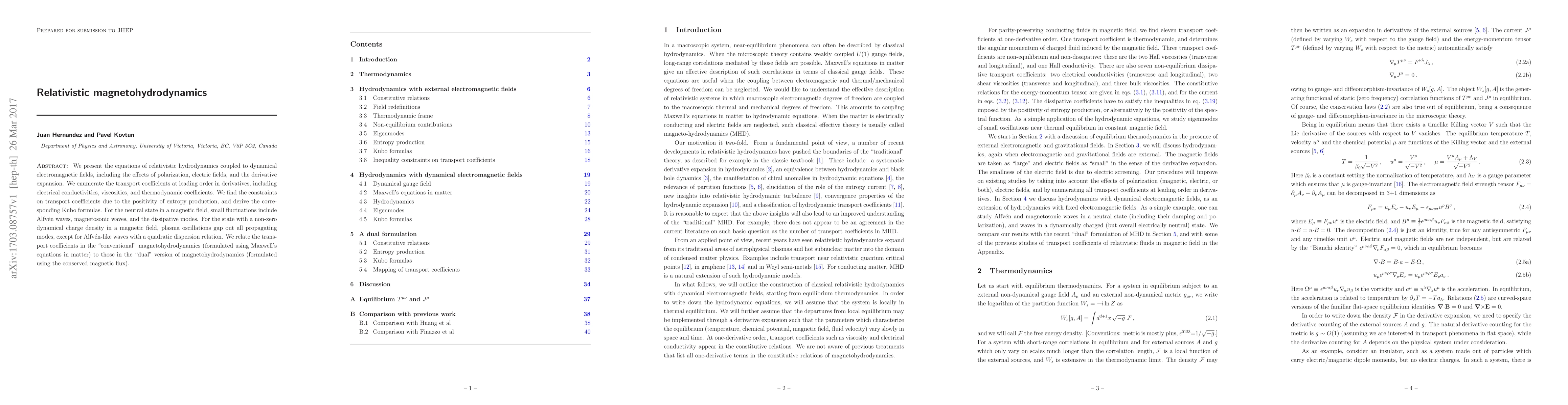 This paper develops relativistic magnetohydrodynamics equations, incorporating electromagnetic fields and polarization effects. It identifies transport coefficients and discusses constraints from entropy positivity, and relates conventional and dual magnetohydrodynamics formulations.